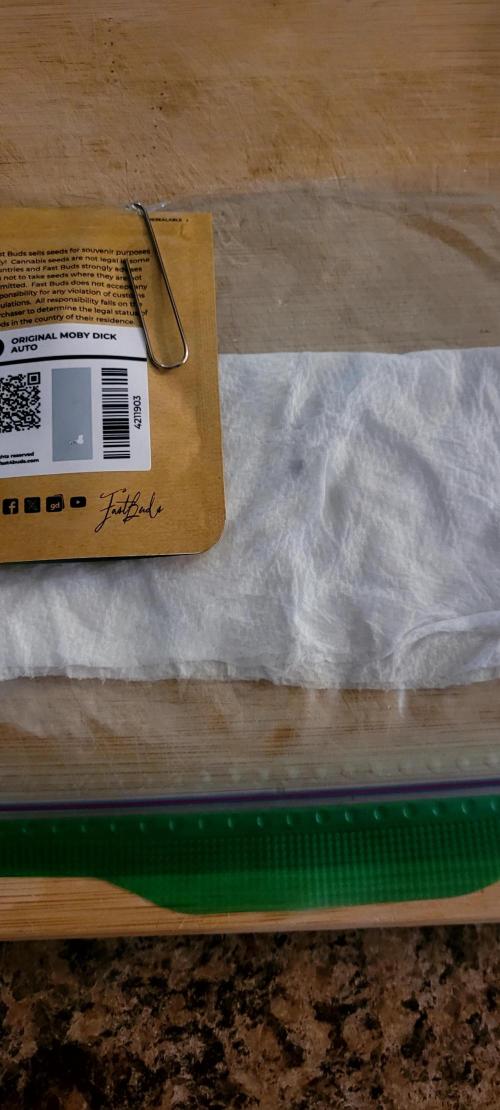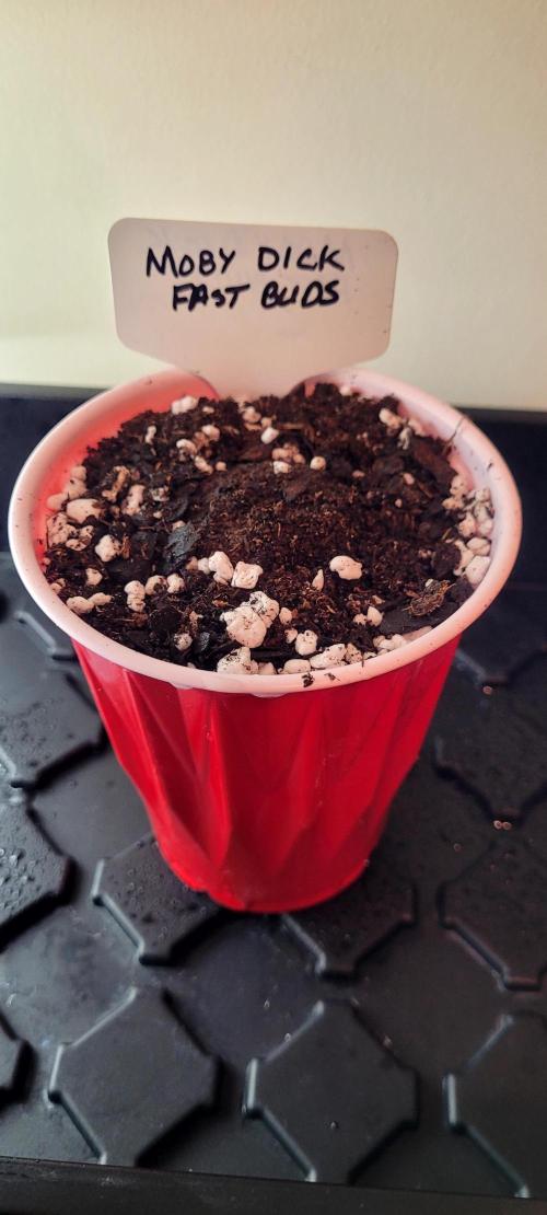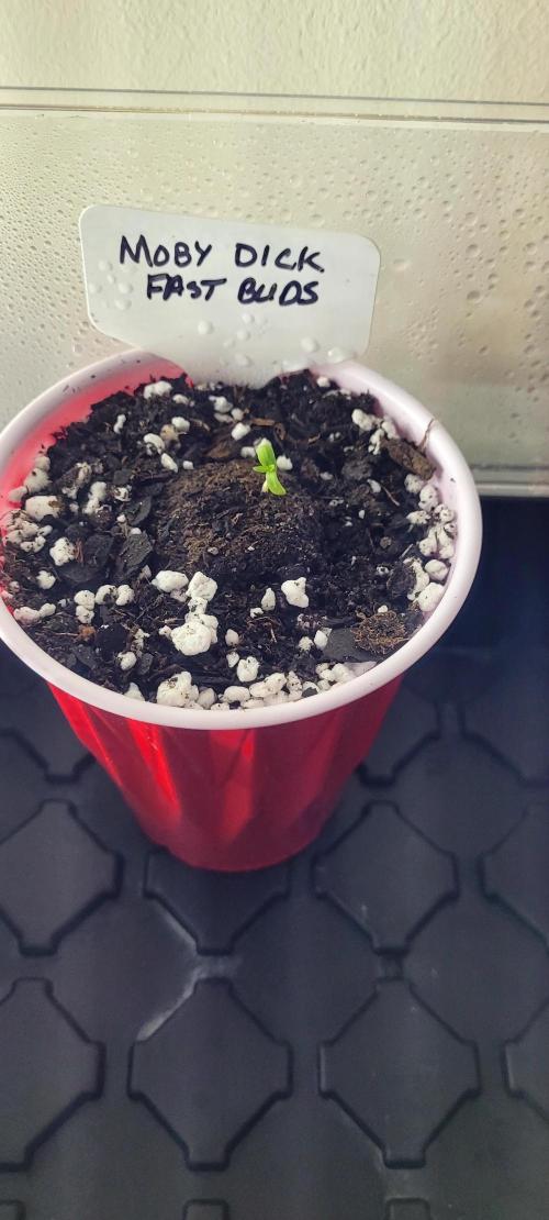 VirginiaGrower This little girl was a last-minute addition, but very much looking forward seeing her pop out! :-) Once sprouted she is being placed in a Rapid Rooter by General Hydroponics and Plantonix's Myco Bliss Powder inside a Solo Cup filled with Fox Farm's Happy Frog soil and then placed in the AC Infinity Humidity Dome Germination Kit with it's Samsung LM301H EVO LED Lighting. Her taproot appeared on October 1st, after several hours she was big enough to plant into her new temporary home. She finally appeard with her first leaves Oct. 3rd 😀