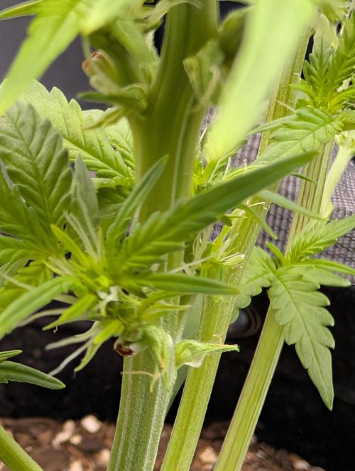 Mums_The_Word Week 6 started off with defoliation and nutrients feeding. I did raise the light a few inches. Hair pistols are starting to form, especially after the feeding The pictures show before defoliation after defoliation and then new growth after the feeding and a few close-ups of the hairs