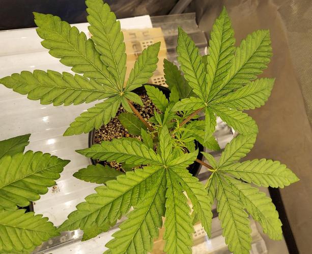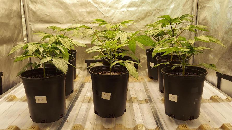 So, as I approach potting up to final 5-gal pot (10 days or so), one more plant has to fall behind to make the decision easy - one of these MM is defnitely the weakest plant. Only eight will be flowered. I expect to throw out a couple strong plants in this process, but this time I needed the full 16 starts to ensure eight strong plants. That's the whole point to gaurantee at least eight strong plants. Throwing out a strong a plant or two is an acceptable cost for the sake of a consistent crop from seed.