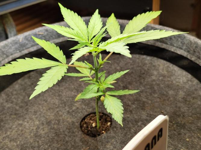 Tag 28: Die Membrana Hyper Autofem von VIP Seeds wächst langsamer als die anderen, auch bei ihr sind die Seitentriebe zu sehen..