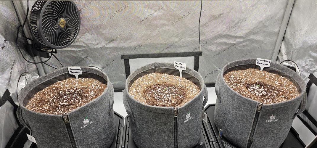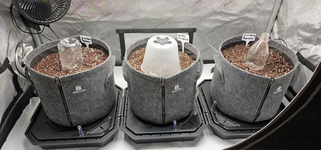 Disten Keimung verlief reibungslos. Das wird mein erster Coco only Grow ich bin gespannt. Nach der Keimung habe ich erstmal nur das Substrat um den Keimling feucht gehalten. Heute nach 48 Stunden gab es etwas CANNA RHIZOTONIC 0.5 ml auf alle 3 Keimlinge verteilt beim Wasser zum befeuchten, EC war 0.8 und PH 5.9. Die Keimlinge bekommen einen PPFD von 260 bis 310 ( gemessen mit Bloomstar ePAR Meter KEIN Phone APP gedönz ) für die erste Woche.
