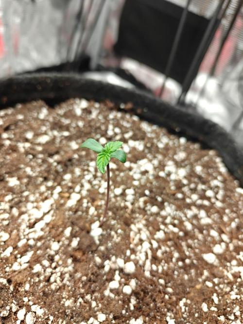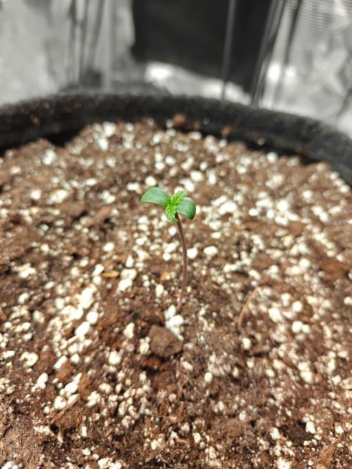 I will start counting today as day one. her cotleydon leaves were fully spread open this morning and I moved the coco plug into the 11l pot in the grow tent. Also watered her in with about 80ml's of water containing the same nutrients as the plug was soaked in.