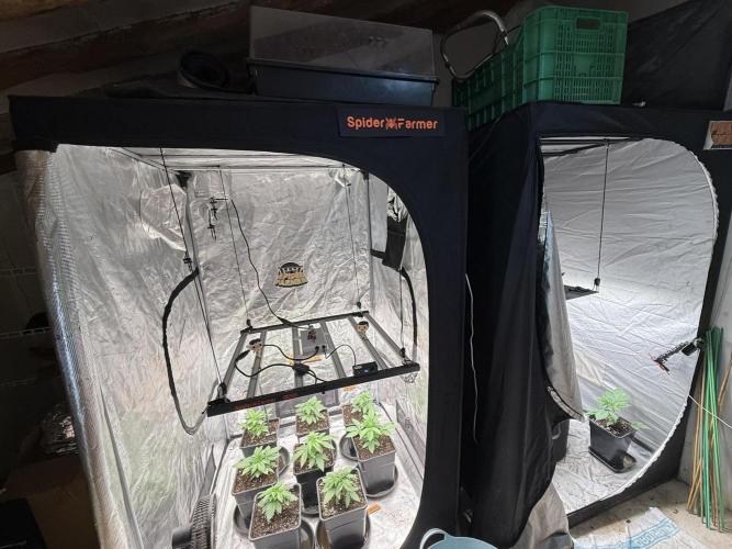 xmackobox Vale pues cultivo arrancado. En un futuro próximo en el indoor de la derecha, el que tiene la planta en 100L haremos una apical para dividir la cola en dos y además mas tarde, otras 2 apicales en cada cola para tener un total de 6 colas con la planta totalmente abierta. Haremos varios tutorados con piquetas y aplicaremos técnica LST