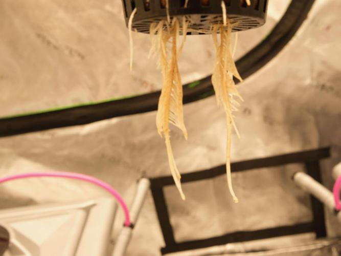 Roots are long, white, and branching — at least 4–6 inches hanging freely into the SuperPonics reservoir.
