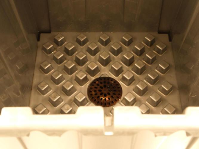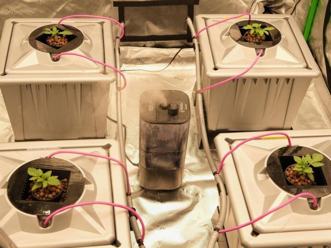 Water level just below net pots; bubbles lightly mist the bottoms.