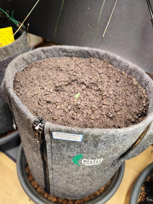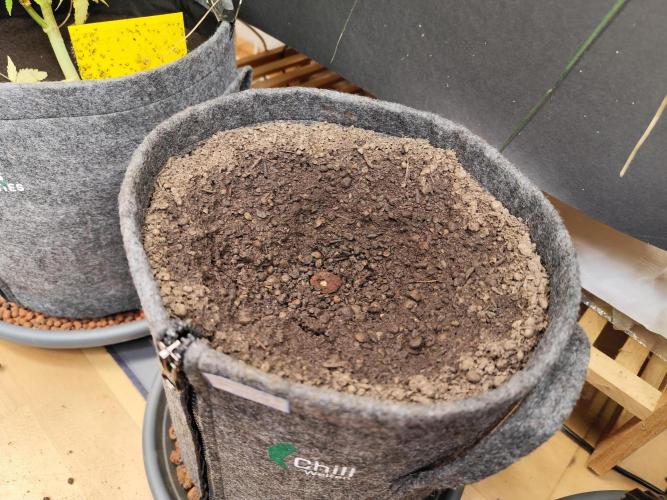 Beide Strains erhalten die gleichen Bedingungen. Beide stehen in einem 9 Liter doppellagigen Stofftopf von ROOTIES (ChillWelten war der Vorgänger der Firma, heute heissen alle ROOTIES), beide haben die Sonnenerde Bio Hanferde und bekommen und später gibt's noch eine Mulchschicht mit Sonnenerde Bio Faser. Beide haben am Anfang eine Bioledex mit 10W im gleichen Abstand.