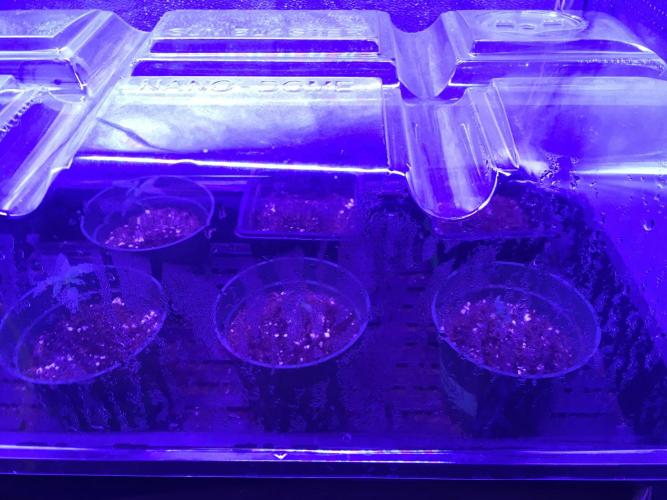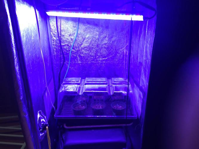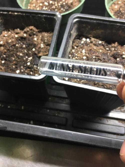 Started right in the soil. Dug a small hole, dropped some myco in, and plopped the seed down. Gave them a little water and a whole lot of wishes to grow. Hopefully all six sprout. They are on a heat mat, in a closed humidity dome. Soil is around 21 C. T5 is running from 0500-2300.