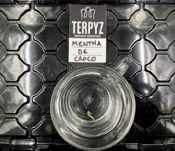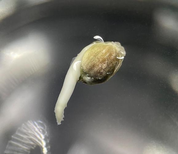 Terpyz Mutant Genetics - Mentha de Croco Bx1 F2 - Fern-Type: After 48 hours in spring water, the bean cracked, and had about 1 cm taproot.