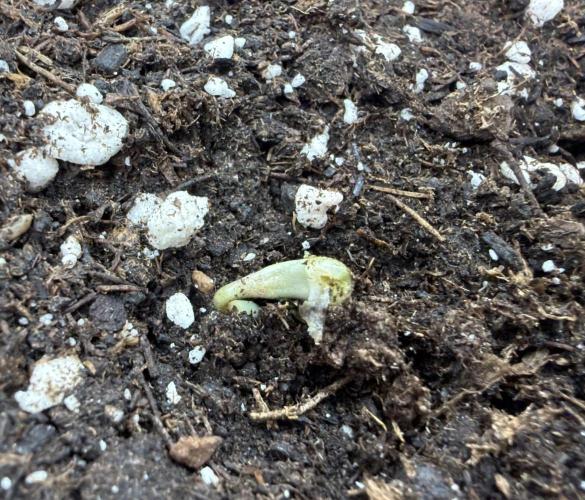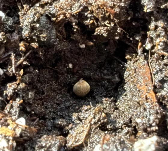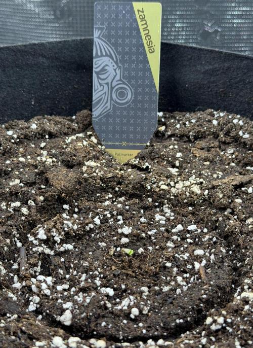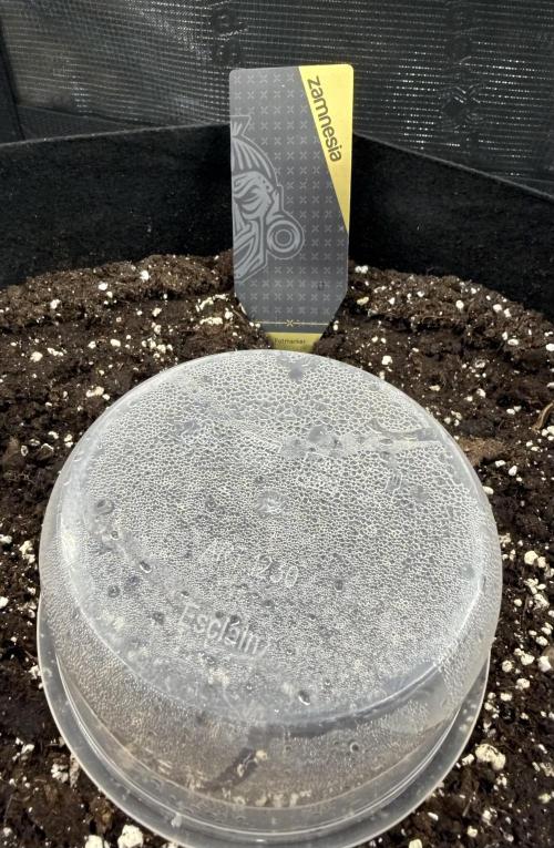The package arrived safe and sound and I immediately went to work unpacking and taking pictures. (Btw, a HUGE 👍 to Zamnesia and the Carriers for their services! My order arrived sooner than expected.) If I want to present something nice on halloween, she is going to need to germinate as quickly as possible. Prepared a 20L pot with a little bit of CalMag and Microbes and stuck the seed in, pointed side down. Closed up the hole and put a lid on it.