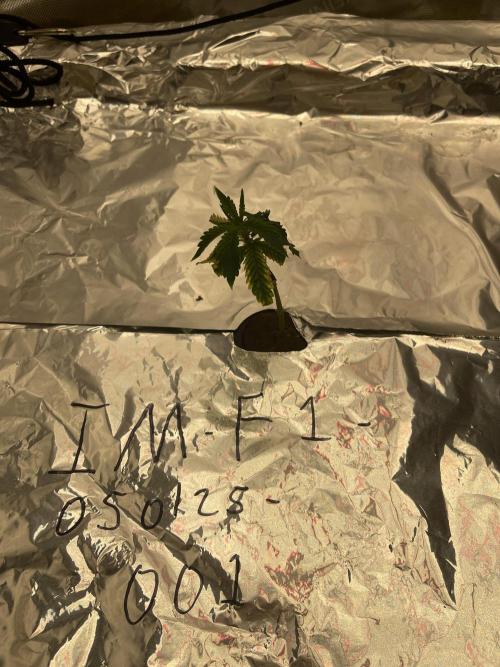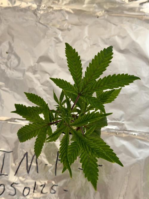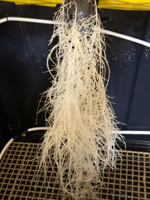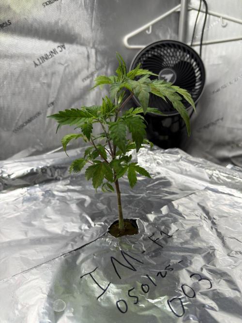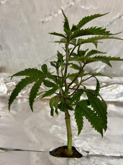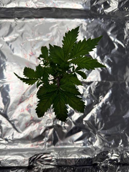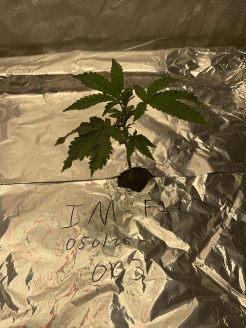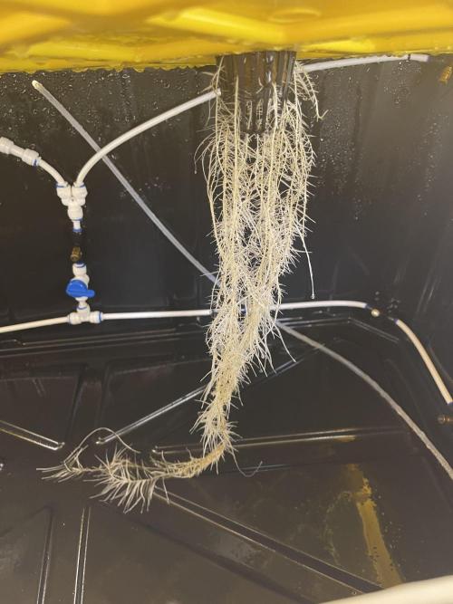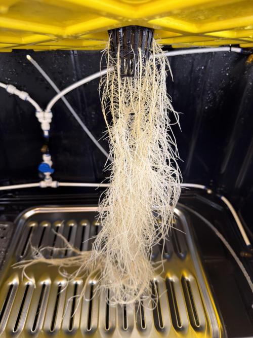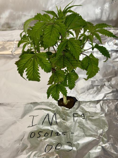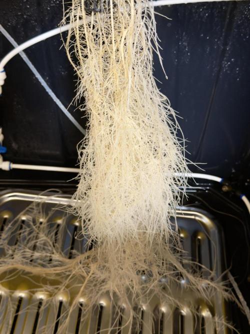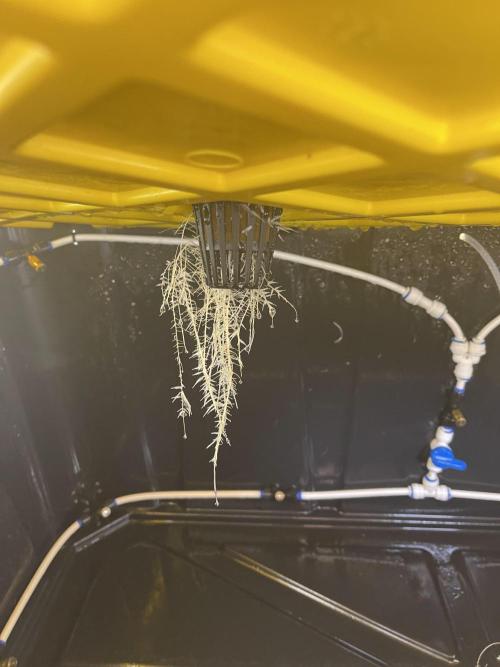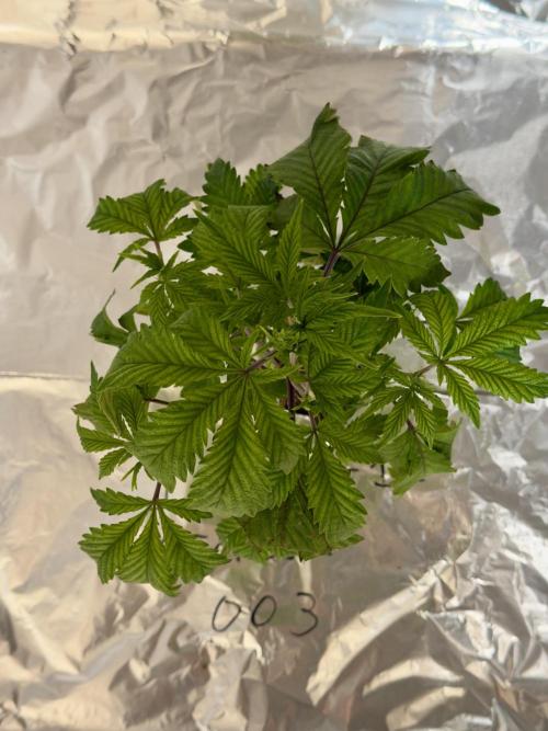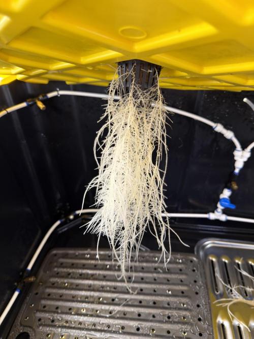Dudemann Plant 003 (vigorous pheno) — Week 3 status Morphology: orthotropic apical dominance, moderate internodal length, strong lateral initiation. Canopy tissue: • Early week: interveinal chlorosis + marginal bronzing localized to older fans (classic Mg draw-down with ultra-pure water + K competition). • Late week: new growth fully re-greened, uniform lamina gloss; no tip burn. Stems/petioles: anthocyanin pigmentation (genetic; not deficiency). Rhizosphere: bright white, dense trichoblasts (root hairs), intact apical caps; slight suberization at crown (normal structural maturation). Verdict: Deficiency arrested; photosynthetic apparatus stabilized. Ready for modest EC/DLI increase in Week 4. ⸻ Plant 001 (compact pheno) — Week 3 status Morphology: tight internodes, strong cambial thickening (secondary xylem), high stem:height mechanical index. Canopy tissue: uniformly dark green; only residual lower-leaf freckling from early transition (non-progressing). Leaf posture: slight adaxial cupping on a few mid leaves (VPD adaptation, not stress). Rhizosphere: high-density lateral branching; “aeroponic fuzz” root hair carpet; immaculate white. Verdict: Vigorous and balanced; ~5–7 days behind 003 by genotype, but accelerating into exponential vegetative phase. • 003: Mg deficiency resolved; upper canopy deep green; strong turgor; no new lesions. • 001: Continuous healthy expansion; no active deficiencies. • Roots (both): white, turgid, high hair density; no biofilm; pre-pulse satin sheen confirms correct mist interval. • System: pH stable around 5.8; EC stable; Adjustments made during Week 3 • Top nozzles disabled (sputter risk) → bottom perimeter loop only. Week 4 Load Out: Targets: EC 0.85–0.90 mS/cm, pH 5.75–5.85, ORP 250–300 mV, water 64–67 °F. Reservoir formula (per 5.0 gal / 19 L) -Armor Si: 2.5 mL -Calimagic : 6.5 mL – slight bump for Mg to arrest early interveinal chlorosis. -Flora Micro: 16 mL -Flora Bloom: 16 mL -Flora Grow: 2 mL (kept low to avoid K-dominance and Mg antagonism) -Floralicious Plus: 1.0 mL -RapidStart: 2 mL -Purpinator: 10 mL -SLF-100 : 10 mL Biologics -Tribus: 1.25 mL -King Crab: 1.25 mL -Orca: 0.6 mL Day temp: 77–80 °F (25–26.5 °C) Night temp: 72–74 °F (22–23 °C) RH: 65–70% → VPD 0.9–1.1 kPa DLI: 20–22 mol·m⁻²·d⁻¹