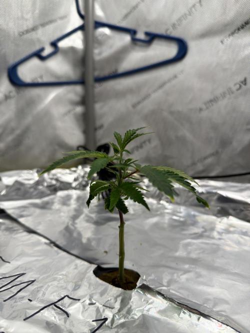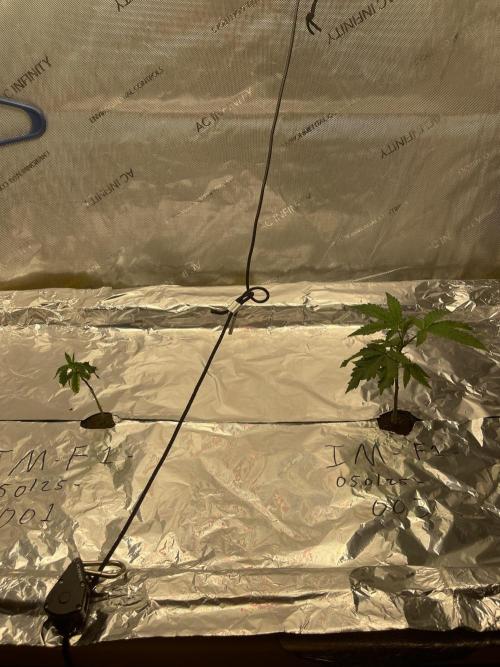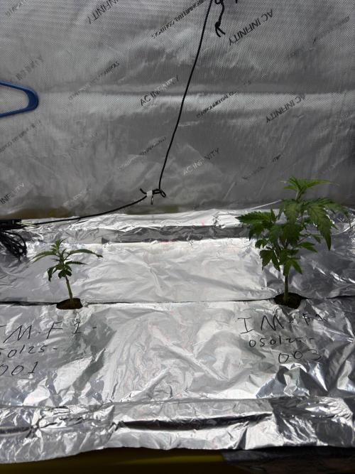 Dudemann Back story- had a mishap with my original clones. Tried clone collars for the first time and failed. Unfortunately trimmed the crap out of my mothers so I had to take small cuts for this run.. either way they’re rooted and on the up. Week 1 load out directly below scroll past and I have the whole set up listed out. LOAD-OUT — VEG WEEK 1 (Oct 5 - Oct 11, 2025) AERIAL ENVIRONMENT (IONFRAME EVO3, AC Infinity 69 Pro) Photoperiod: 18/6 DLI/PPFD ramp: - Sun-Mon: DLI 10-11 (PPFD ~155-170) - Tue-Wed: DLI 12-13 (PPFD ~185-200) - Thu-Sat: up to DLI 14-16 (PPFD ~215-245) only if leaves are praying and color improving Temps: 74-79 F lights on; 70-74 F lights off RH/VPD: start 65-70% (VPD 0.9-1.05 kPa), drift to 60-65% by week end (VPD 1.0-1.15 kPa) Airflow: gentle oscillation; avoid direct breeze on 001 UVA bars: OFF this week CO2: ambient Balance note: give plant 001 about +10-15 umol more center-beam than 003 ROOT-CHAMBER ENVIRONMENT Pulse: 2.0 s ON / 5:00 OFF Droplet spectrum: Dv50 ~80-90 um Root zone temp (RZT): 65-67 F pH: 5.7-5.9 ORP: 200-300 mV (microbe-friendly) RESERVOIR (per 5 gal) Source: dehumidifier condensate Step 1 - Sterilize: add 25-30 mL plain 6% Clorox per 5 gal; keep lid on 3 days Step 2 - Dechlorinate and polish: Camco TastePURE RV (GAC+KDF) - WaterSentinel SF-20W DI Goal EC (fresh): 0.50-0.55 mS/cm DOSING (per 5 gal) Armor Si: 1.0 mL Calimagic: 3.0 mL Flora Micro: 5.0 mL Flora Bloom: 5.0 mL Flora Grow: 1.0 mL Floralicious Plus: 0.5-0.75 mL RapidStart: 3.0 mL SLF-100: 2.0 mL Microbe rotation: - Sun (fresh res): Tribus 1.0 mL (~1/4 dose) - Wed/Thu (top-off or mini-refresh): King Crab 0.5-1.0 mL HARDWARE (REFERENCE) High pressure misting specifics: Each 0.2 mm nozzle @ 140 psi ≈ 0.051 L/min → ~1.7 mL per 2 s pulse. All 16 nozzles = ~27 mL delivered per pulse → ~308 mL per hour total system output. Accumulator keeps pressure drop 5 psi on valve open — zero after-drip. Droplet Spectrum: Dv50: ~80–90 µm (ideal HPA range) Dv10–Dv90: ~40–140 µm spread Fine enough for high O₂ exchange, dense enough to stay wet without drip. Tent and structure - CLOUDLAB 642 (4x2 ft, 72 in) - 40 gal HDX tote (root chamber) with sealed lid Lighting - IONFRAME EVO3, 280 W (2x4 ft) - IONBEAM U2 UV LED bars, 2-bar kit, 11 in Air movement and environmental - AC Infinity Controller 69 Pro - Air Filtration Kit PRO 4 in (inline fan + carbon filter + ducting) - CLOUDRAY S6 Gen 2 clip fan, 6 in - AC Infinity CLOUDFORGE T3 humidifier - Portable air conditioner (room/tent) - Water chiller (reservoir) High-pressure aeroponics (core) - Aquatec 8800 booster pump - 5 gal pressure accumulator tank - Beduan 12 V normally-closed RO solenoid valve - BN-LINK short-period repeat cycle timer - 16x hydraulic mist nozzles, 0.2 mm orifice - 10x on dual 1/4 in concentric closed-ring manifold (bottom ring) - 6x top-mounted array (upper chamber) - 1/4 in tubing (manifold + feeds; dual concentric loops) Reservoir and fluid handling - 5 gal side reservoir (chilled) - Airstone bubbler (reservoir aeration) - Buckets for source-water prep and transfers - Inline filtration (post-sterilization): Camco TastePURE RV - WaterSentinel SF-20W DI Source-water sanitation - Clorox unscented 6% sodium hypochlorite (bleach) Instruments and meters - pH meter/pen-Apera Instruments AI311 Premium Series - EC/TDS meter - Tent thermo-hygrometer (for VPD) - Photone PAR meter app - GIDIGI 8-in-1 handheld water sensor(for resevior) Media - Oasis Rootcubes #5015 sheets(clone)
