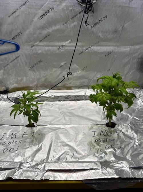 Dudemann IRIE MAIDEN (ROMULAN GENETICS) week 4 status. Week 3 – Photoperiod correction: Discovered light on 24/0. Returned to 18/6 tonight. -DLI jump: With the same PPFD, going from 18/6 → 24/0 increases DLI by 33%. DLI = PPFD × photoperiod ÷ 1e6. -Transpiration & demand: More light hours = higher water flux and Mg/ Ca demand → can trigger interveinal chlorosis on older leaves and mild adaxial taco up top. -Circadian disruption: Mature clones prefer a dark period (phytochrome reset IM-001 (Compact Pheno) -Uniform medium-deep green canopy with upright petioles and no chlorosis. -Slight adaxial cupping on upper fans = normal transpiration control, not drought. -Tight internodes; strong secondary xylem at the base gives a sturdy stem. -Roots → bright white with satin sheen; dense lateral branching and glassy tips. -Mild basal suberization only – excellent oxygen diffusion. -Overall = healthy, compact, gaining vigor, about a week behind 003 but accelerating. IM-003 (Vigorous Pheno) -Lush medium-green foliage; older fans show only faint, non-progressing Mg speckling. -New growth flawless – no burn or curl. -Apex shows minor upward cupping from VPD regulation; petioles fully turgid. -Roots → snow-white, nacreous finish, dense trichoblast carpet, no biofilm. -Architecture → orthotropic apex with strong lateral initiation and balanced spacing. -Fully assimilating nutrients; vigorous vertical and lateral expansion underway. IRIE MAIDEN (ROMULAN GENETICS) — WEEK 4 VEG LOAD-OUT Stage: Veg Week 4 (Oct 26 – Nov 1 2025) Target EC: 1.05 – 1.10 mS/cm pH: 5.7 – 5.9 RZT: 66 °F Photoperiod: 18 / 6 DLI: 23 – 25 mol · m⁻² · d⁻¹ VPD: Day ≈ 1.0 kPa | Night ≈ 0.8 kPa UV bars ON for 30 min end-of-day (UVA 370–385 nm). No dehumidifier water - Water source: Tap water (EC 0.268 mS/cm) • Dechlorination: ½ tablet (≈ 250 mg) Nature Made Vitamin C (ascorbic acid), crushed and dissolved; neutralized all residual chlorine/chloramine within 10 min. Feed Recipe (Per 5 gal) -Armor Si – 2.5 mL -Calimagic – 6 mL -Flora Micro – 16 mL -Flora Bloom – 16 mL -Flora Grow – 2.5 mL -Floralicious Plus – 1 mL -Purpinator – 10 mL -RapidStart – 1 mL -SLF-100 – 10 mL -Tribus / King Crab / Orca – ¼ dose each Final EC: 1.095 mS/cm Final pH: 5.79