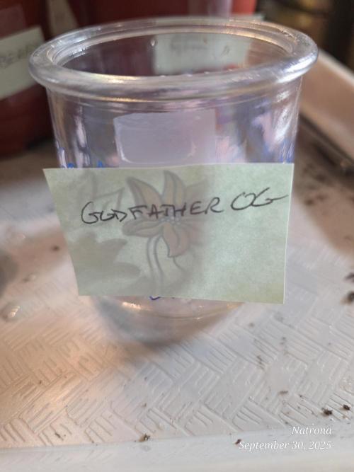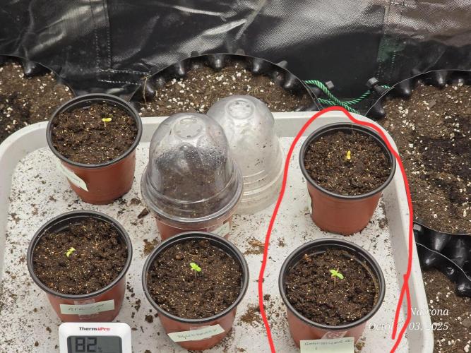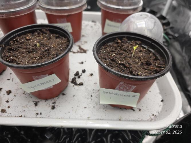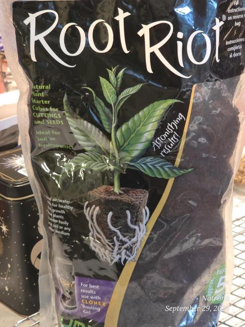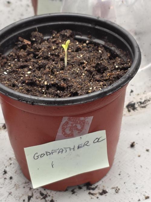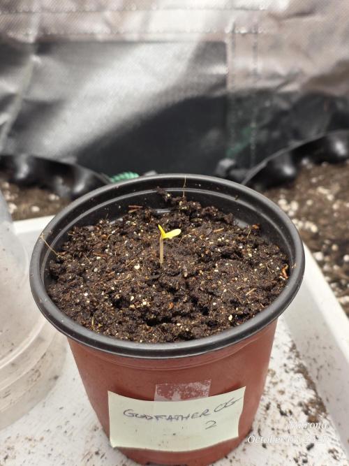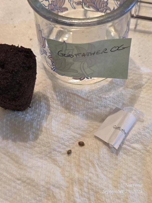 9/30 Then placed the uncracked seed into a root riot cube and placed it in a 4” starter pot with seed start mix, some Dynomyco in the planting hole and lightly covered and misted. The seeds went into the 3x3 in the dark to germinate.
