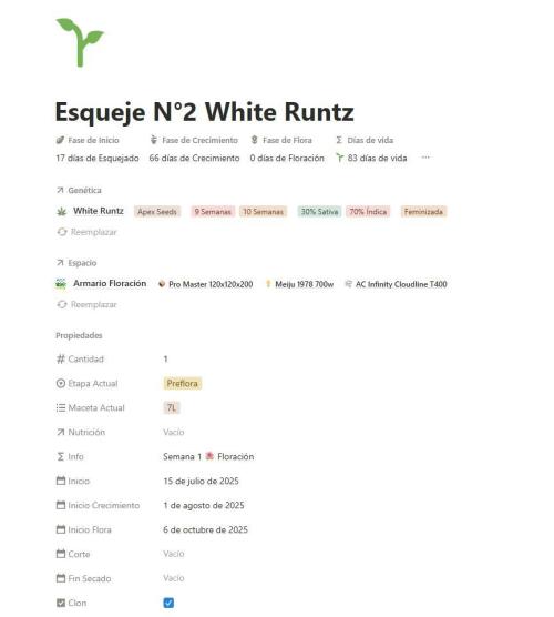 📅 Hemos comenzado el seguimiento en el inicio de floración, el día 06/10/2025. La fase de esquejado fue de 17 días y lleva 66 días de crecimiento, con 2 trasplantes. Comenzaron en maceta de 0.4L, pasó por maceta de 2L y acaba en maceta de 7L para terminar el ciclo.