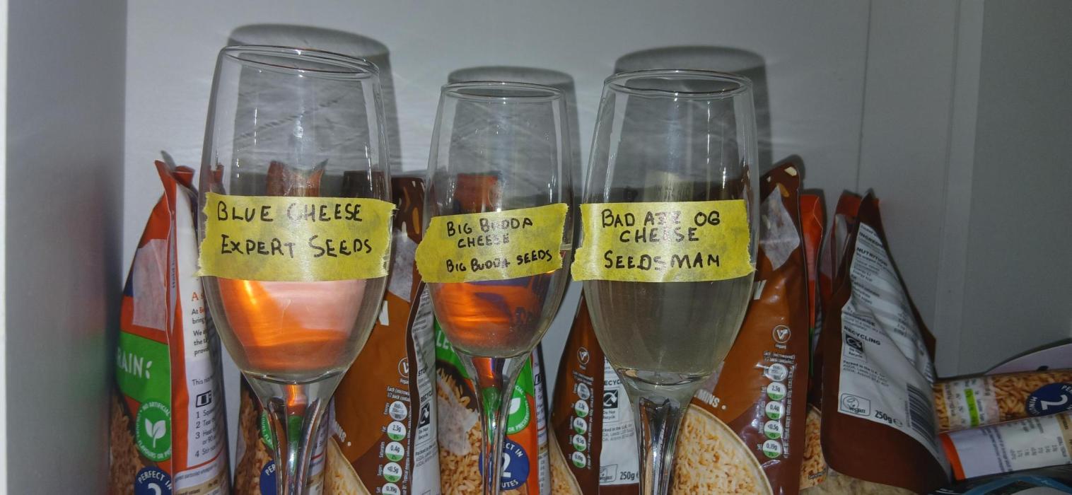 Trinidad Placed seed in glass of water to float. Once root showed I transfered to root roit cubes and place under glass and sprayed with water. Big Buddha cheese is one day behind others.