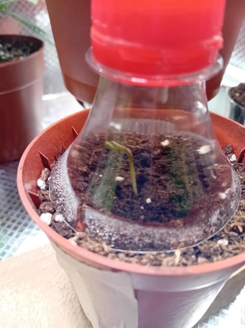 made a hole, filled it with cocos and some myco-granulat - put some soil and the seed (allready a bit cracked) into it and put a few mm soil on it. give some water and covered it.