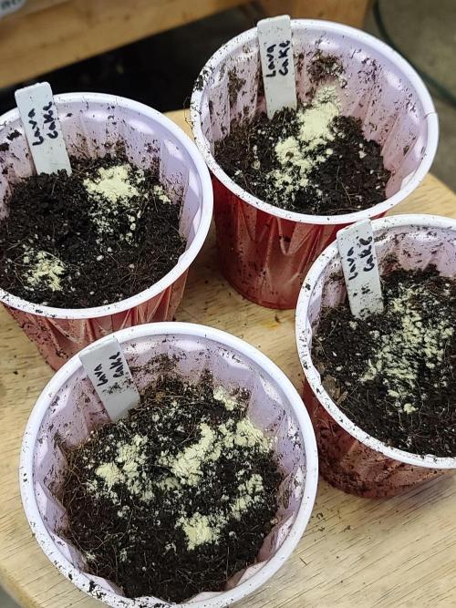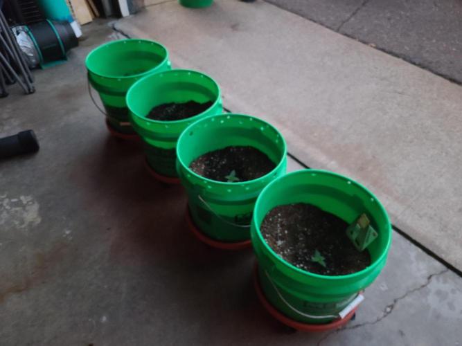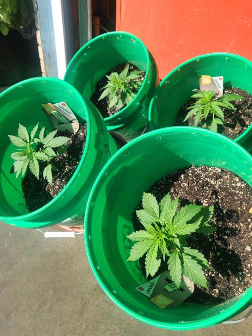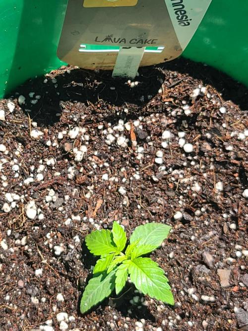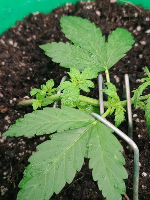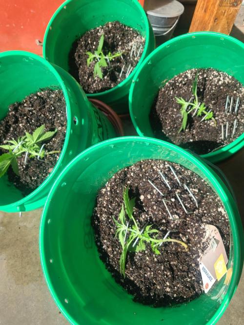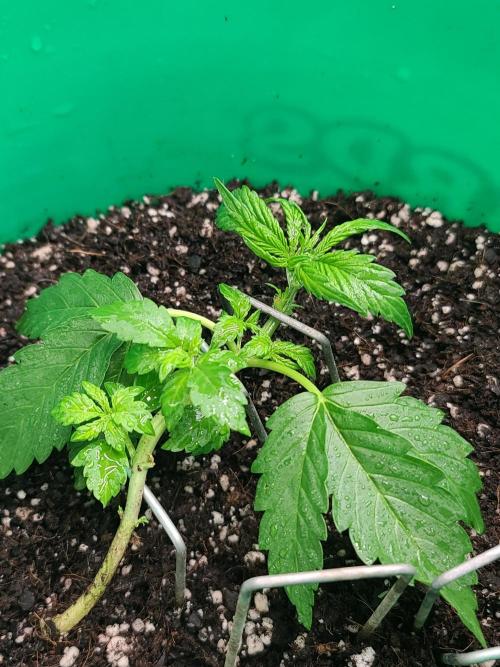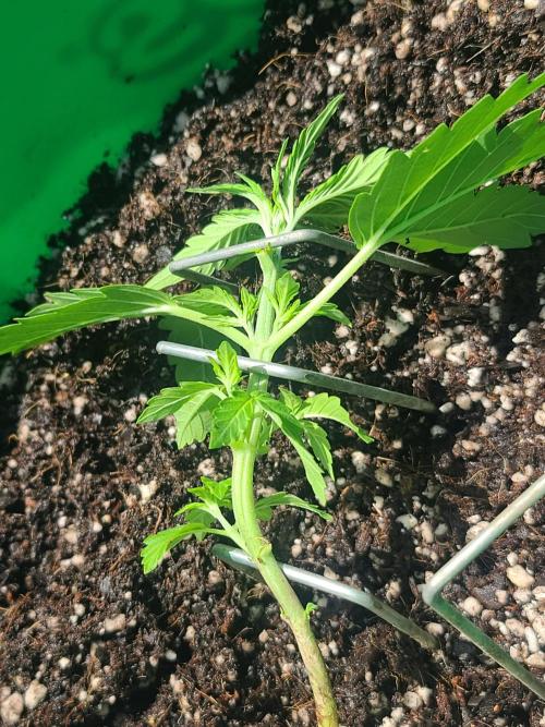 Sapphire9352 Lava Cake is a very easy autoflower to grow. I'm not in the flowering phase, but these plants seem to respond well to everything I have thrown at them. I took them out in thw sun for a haircut and they didn't seem to mind so much. In this instance, I was strategic in how I trimmed them. I used three 6" lawn stakes to suspend the plants stalk horizontally in the air across the surface of the substrate. After that, I cut away any foliage blocking light to the 5 available nodes. The idea here is to let each of these nodes grow up and receive equal amounts of light during flower.