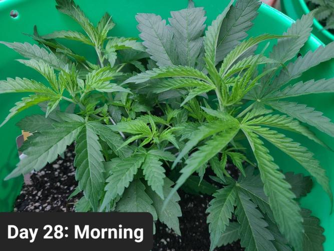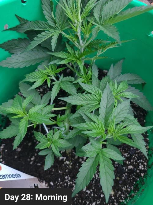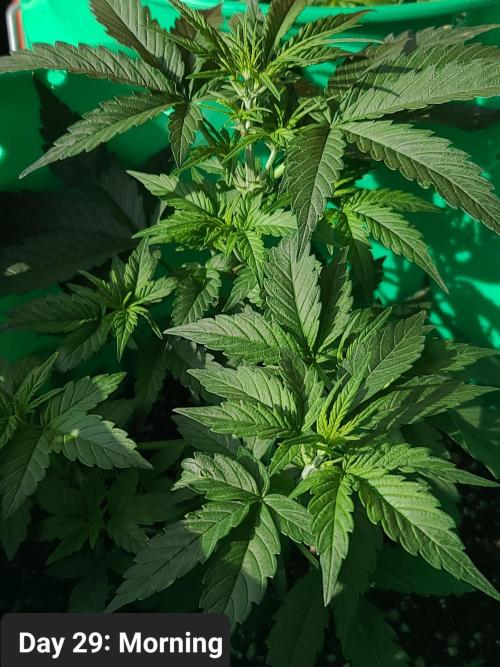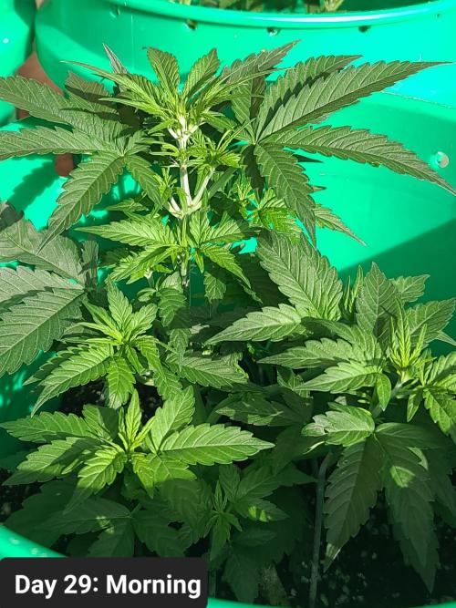 Day 29: ([Morning at time of writing] After a night under some commercial lights, these plants entered the stretch phase. How can one be sure? In the case of my Lava plants, they all on the same day grew roughly 2 inches in a 24 hour period. It's a bit humorous because this is a dwarf/stealth/low-profile type plant with a supposed 2 ft height according to Zam. Mine went from 13 inches to 15 inches overnight. That's a 15.38% size increase in a 24 hour period, wowz!! Great job on the stretch with this one, Zamnesia!! Beautiful little plants thus far.
