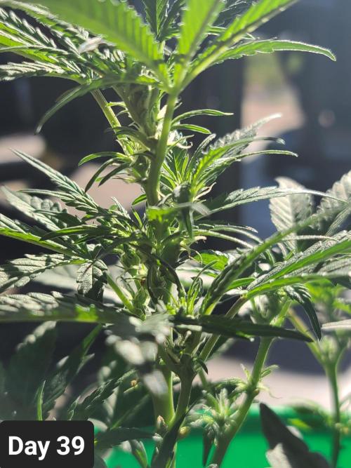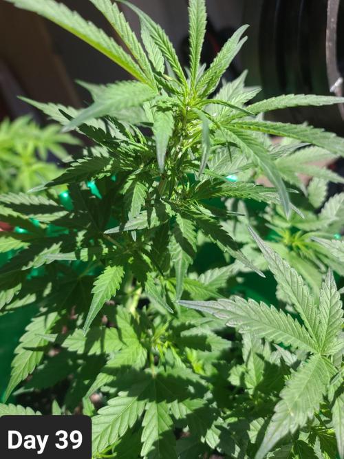 Day 37: Nailed them with a high DLI for a day. In my mind, here's my thinking: In nature you get some big shifts with temps, weather, etc. The plant needs to face adversity and overcome it to be a strong plant. A few times in my grow I will simulate different settings for differing reasons. In this case High DLI from a previous day means the next day I subtract how much over my target DLI I went the day before from the current day I'm on. [Example. Theoretical target DLI is say, 25 for whatever phase. If I want to hit hit hard, I hit it 32 or something the whole day. Next day, I remember I went 7 over, and on that day I simulate a cloudy, lower VPD (higher RH%) day with a DLI of 25 - 7 = 18. Today is my 18DLI or whatever, even though that's not my actual DLI, just the example.]