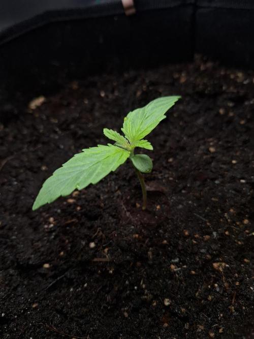 Angesetzt ist eine Runtz von Zamnesia. Es ist der zweite Grow überhaupt in der Box. Ich habe dieselbe Erde verwendet. Der Wurzelballen der Bluedream ist auch noch drin, ich habe den Setzlinge (1 Woche vorgezogen in Kokos Quelltopf) quasi genau neben den alten Stamm gedrückt.