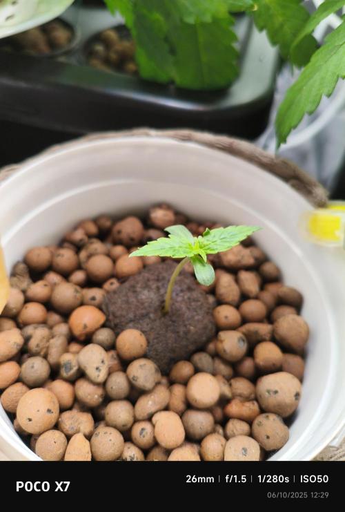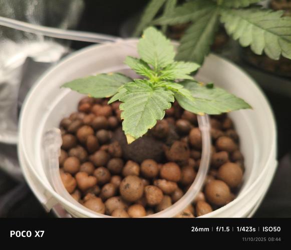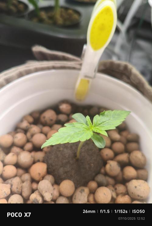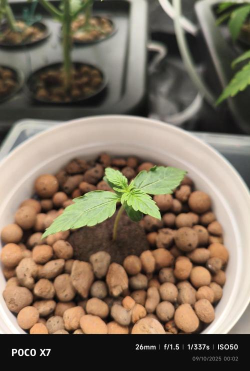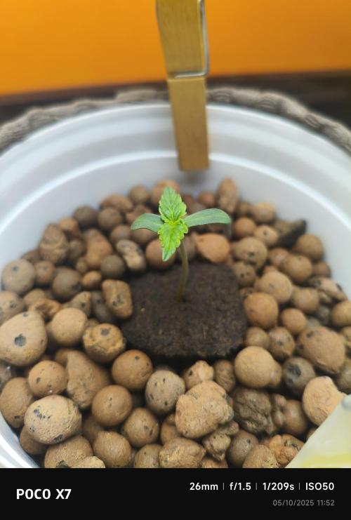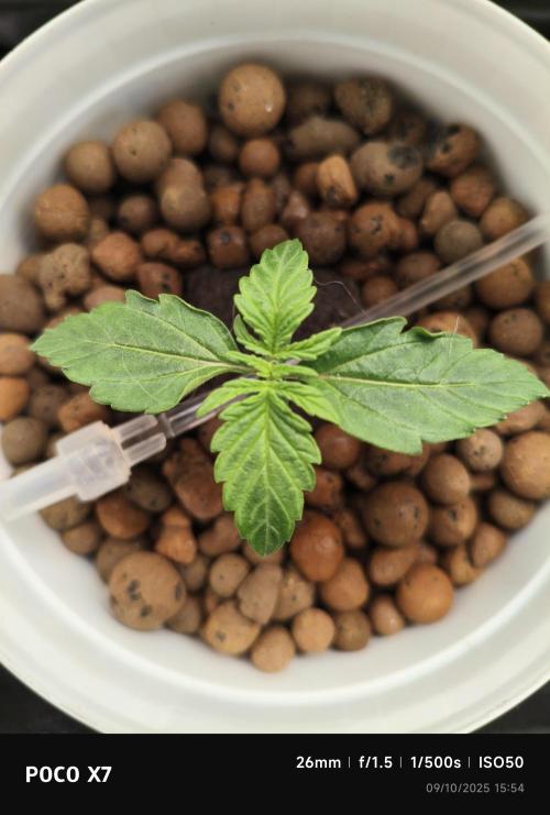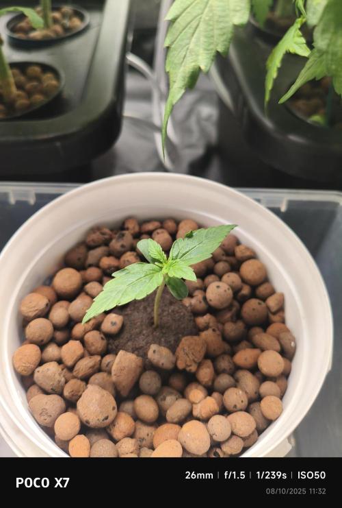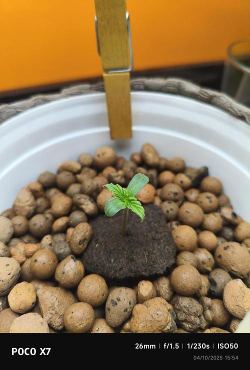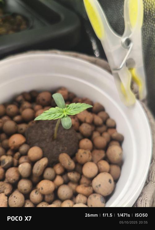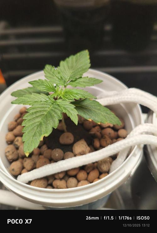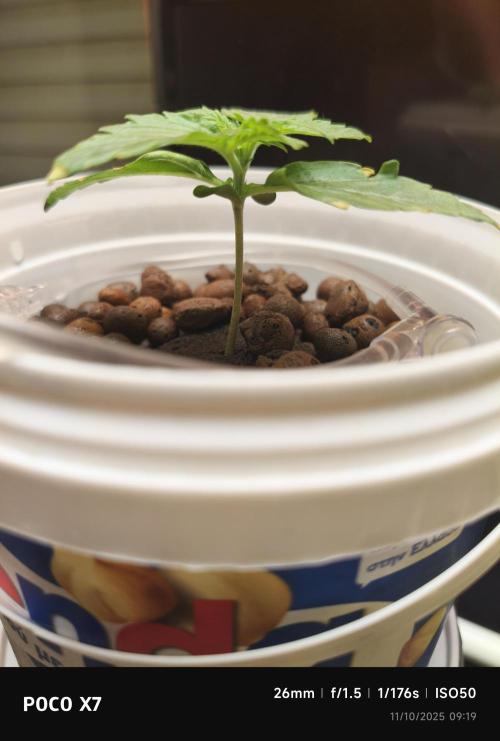 Baby plant grows under 80% strength light (around 190 PPFD) inside a 1 litter custom pot full a clays (cleaned and Ph balanced for a day).