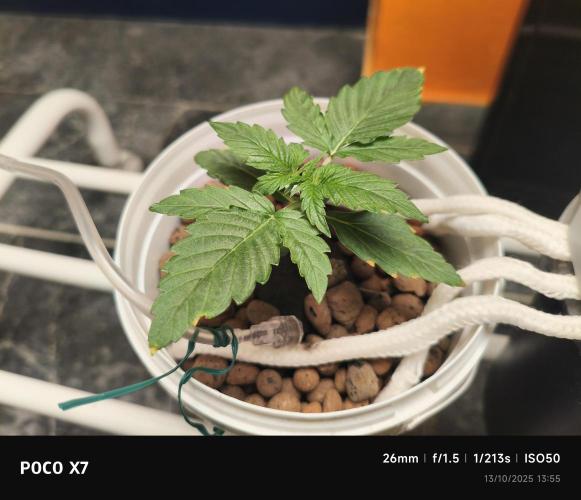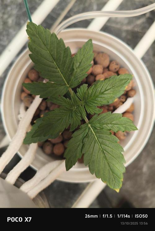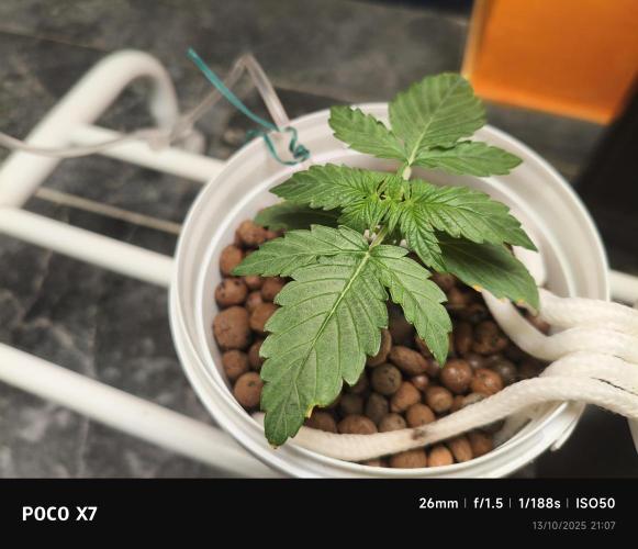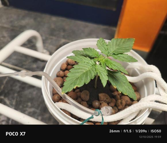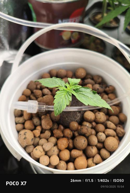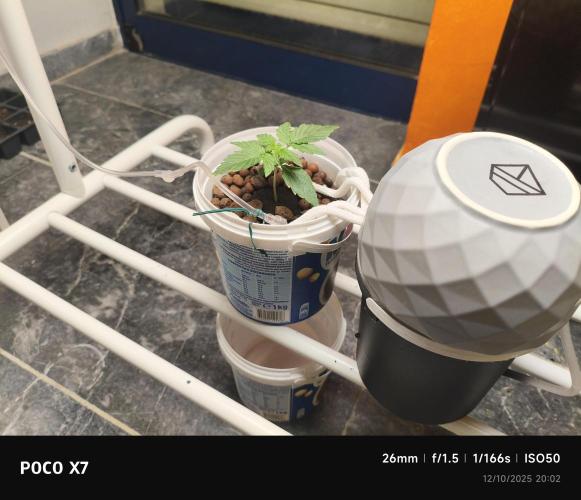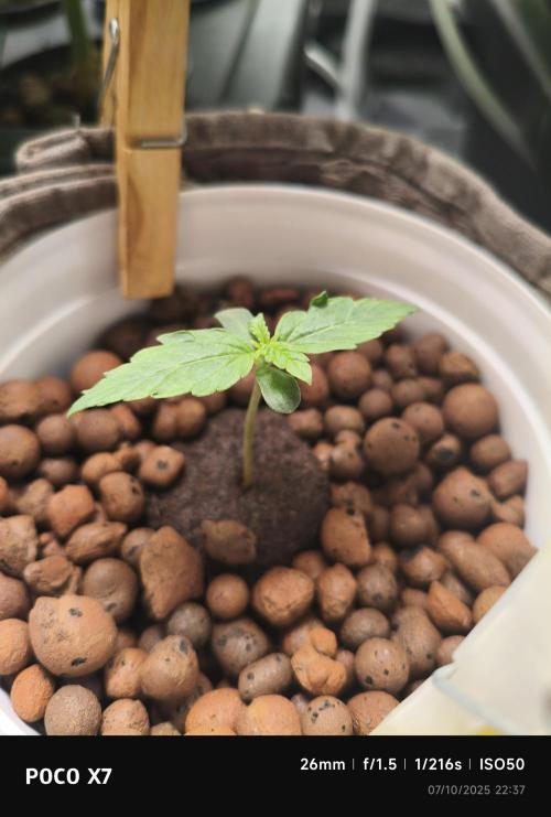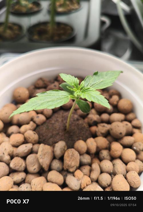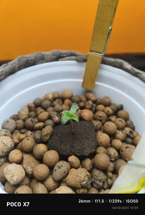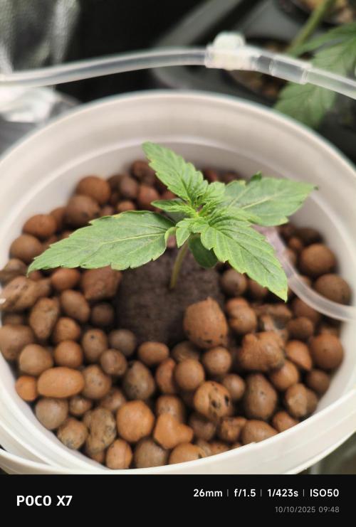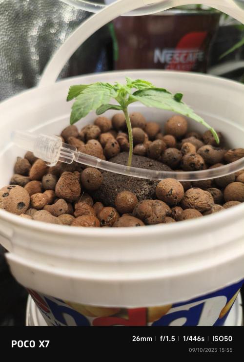 Baby plant grows under 80% strength light (around 190 PPFD) inside a 1 litter custom pot full a clays (cleaned and Ph balanced for a day).