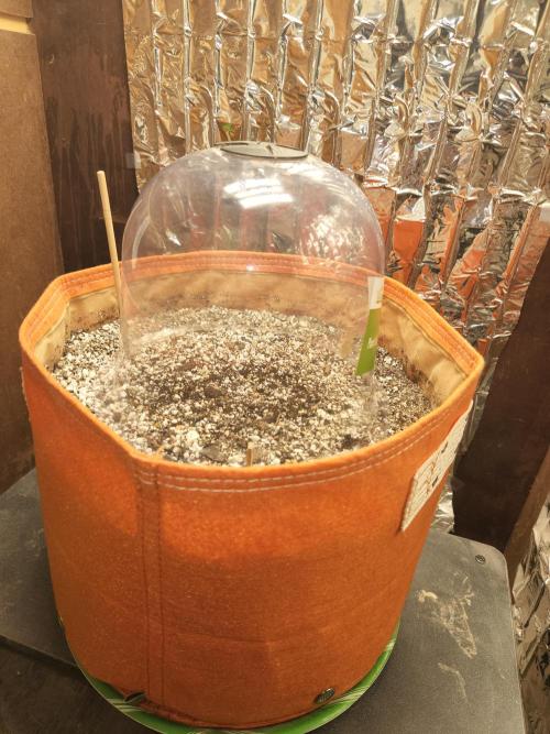 Soaked for 24 hours in 4 oz plain water, then sowed directly into recycled soil mix. 7 gallon Bloem Bagz fabric pot.