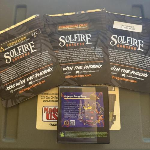 Decimotox Welcome, folks, to the Fall 2025 Solfire x EG Variety grow! We're running four strains - three very new ones from Solfire, and one fairly established one from Exotic Genetix. I'm especially excited about the Papaya Bang Bang and the Trich Beast cross (it's currently unnamed - Last Supper x Trich Beast). Should be gorgeous, frosty plants. This Trich Beast cross with Last Supper was the first of several TB crosses that have made their way onto the Solfire phoenix club's rotating menu in recent weeks. Lately, some FX3 crosses have shown up! Keen to try one or two of those soon, too! I tossed these six beans in cups of water on 10/4 for ~20 hours, then transferred to paper towels in a ziplock bag for another ~22 hours. At that point, all six seeds had taproots about 2.5 cm long. Planted them at noon on 10/6. As of typing this at 10 pm on 10/7, we're seeing them poke through the soil and begin breaking outta their shells. All these cultivars are very "new" (beans are mad fresh), so I expected at least fairly good germination results. This is fantastic. Join me as we grow these girls out! Should be a great ride. Can't wait to see what types of challenges and triumphs we experience. Here are the full lineages of each since they're so new - if you're unfamiliar with SFG or EG gear, hit up google and read about some of these crosses so you get an idea of the lineages (expected terps, quality, etc etc). Crossed Out: Permanent Marker x Cherrylicious Chemtation: CZR (the "Chempire Ztate" cut) x Sin N Juice (This CZR cut apparently leans more toward the Chem side and had the best Chem and Zkittlez terps that wash. Plus grows the tall, Chem-like colas, according to the man who grew it. Can't wait.) Yet unnamed Trich Beast cross: Last Supper x Trich Beast Papaya Bang Bang: Papaya x Blueberry Bang Bang