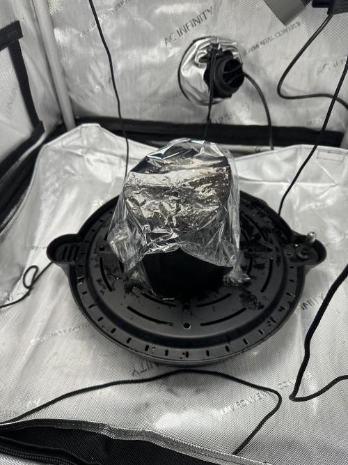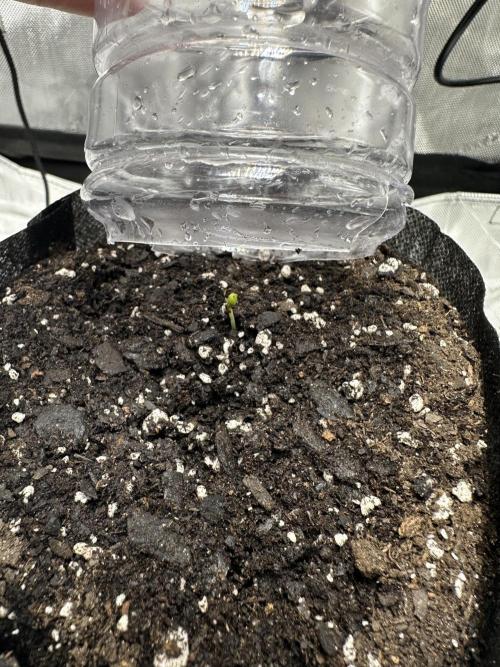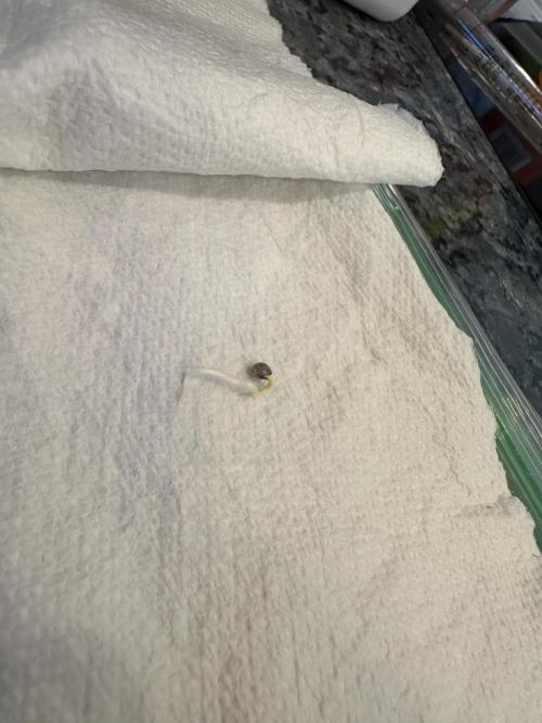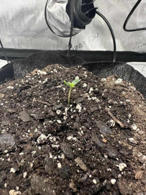TugMasterson New grow, here we go! Excited to grow another of my favorite "legacy" strains. It is off to a great start, I've never seen (albeit my experience is limited) a seed show green that quickly, it was over night! Did my typical germination routine of letting the seed sit in a glass of water over night and then into a moist paper towel in a plastic bag. Once there is a bit of root (as seen in photo) it is time to plant. Used the fabric nursery bag again so transfer will be easy. Will probably have to use the heater since outside temperatures are really dipping. This is my first time using a non-Royal Queen seed, will be interesting to see how it goes.