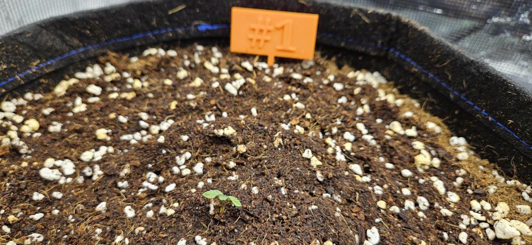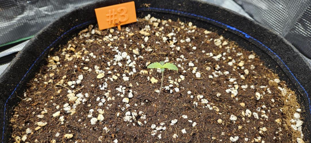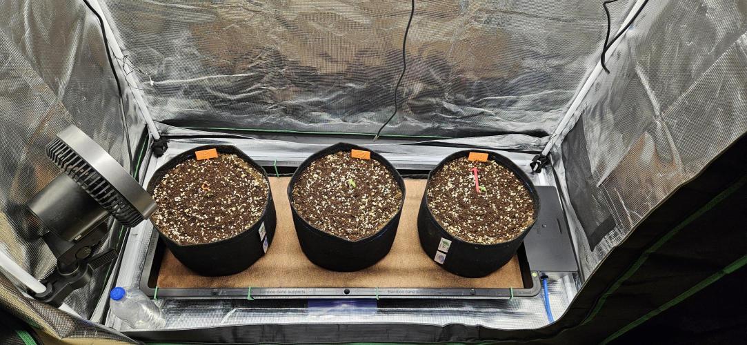 For germination, I put 3 seeds into a wet paper towel in a bag, then placed that bag in my server cabinet. The cabinet stays about 80F-85F, so it should be a cozy temperature for the seeds. This particular strain is supposed to have a lower germination rate, as mentioned by the breeder, and one of three seeds had a great germination period. Two of three seeds broke open, but don't seem to be vigorous seeds. I'm glad that all 3 broke open, but from past experience I know that 2 seeds will be noticeably behind the first. I planted the seeds in the tent in order of strongest to weakest germination. The seed with the longest root was planted in the left-most pot, and the seed with the shortest root was planted in the right-most pot.