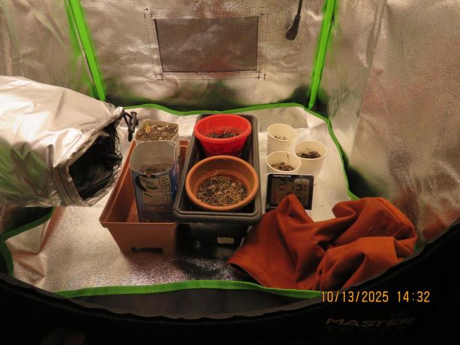13/10/2025 – I transferred the seedlings to small pots with organic soil and coconut fiber, and placed them in the grow tent under LEDs set to an 18/6 light schedule.