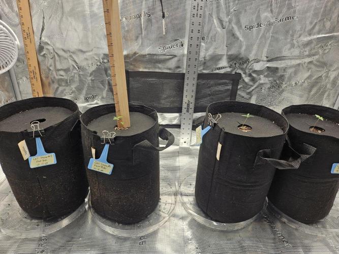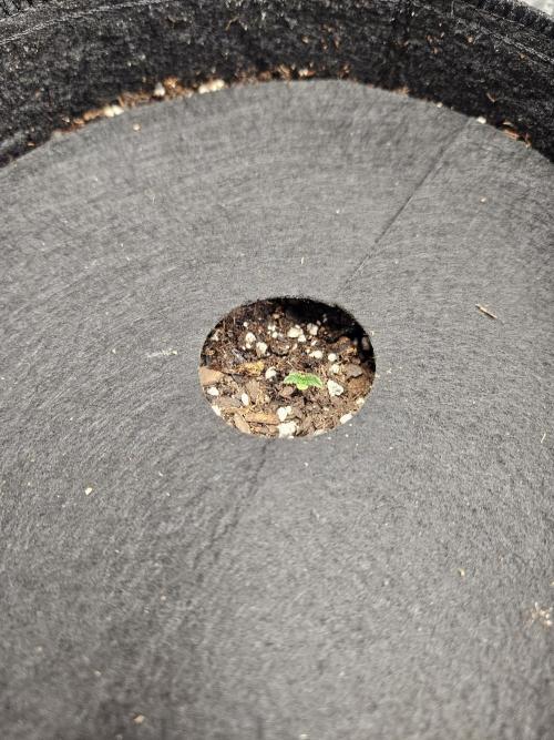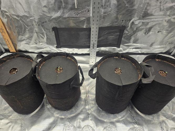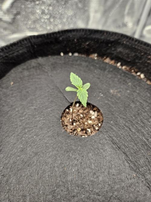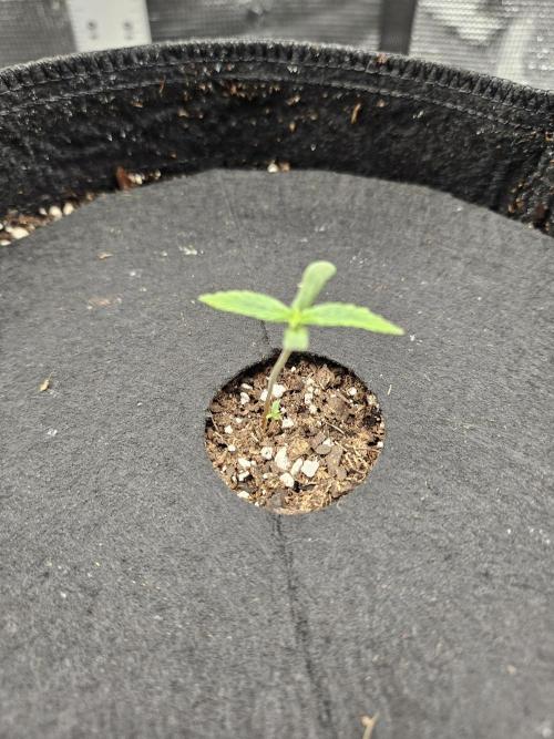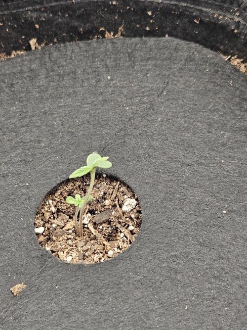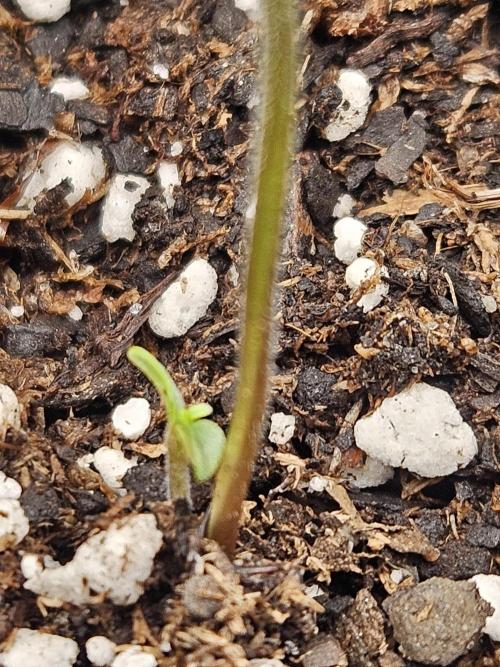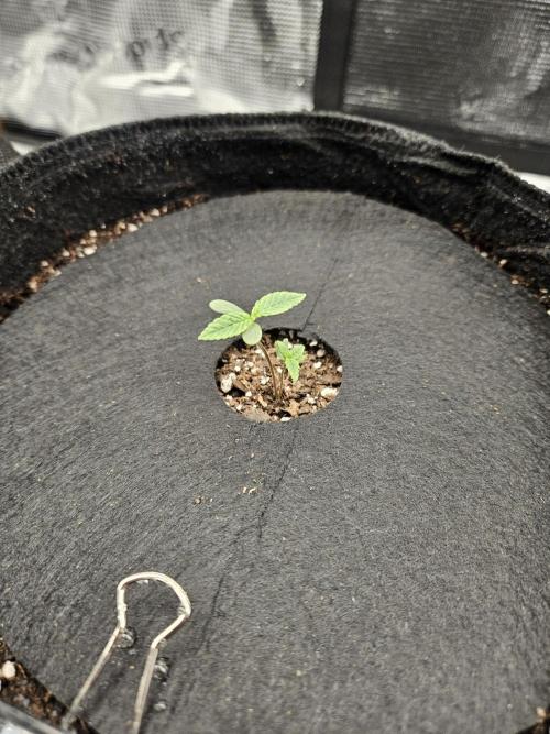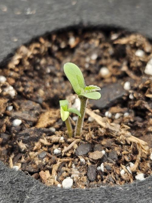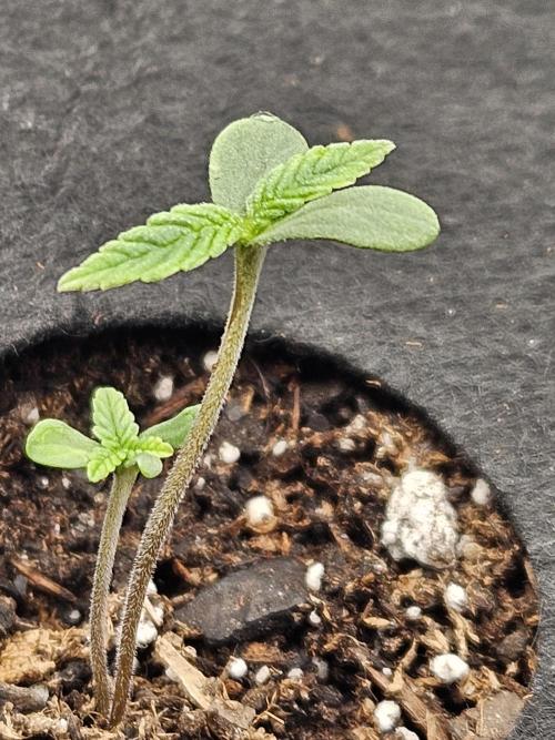 CannaDudeDad Still learning the new lights. Getting some stretching. These genetics are interesting also. Had 2 seeds sprout 2 plants(CS1/CS3). I pulled the smallest out(CS3). One of the smalls has tri-leaves. One seed sprouted upside down(CS4), I put rooting hormone on and replanted to experiment.