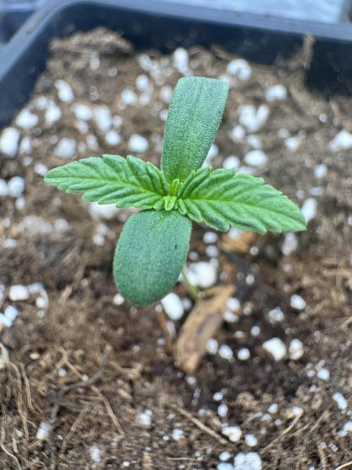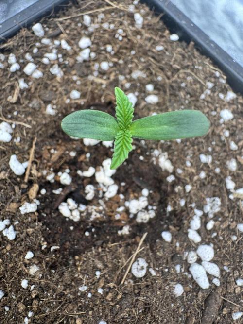 Cotyledons are fully open and the first serrated leaves are developing nicely. The color is a vibrant green, showing good vigor and healthy root growth.