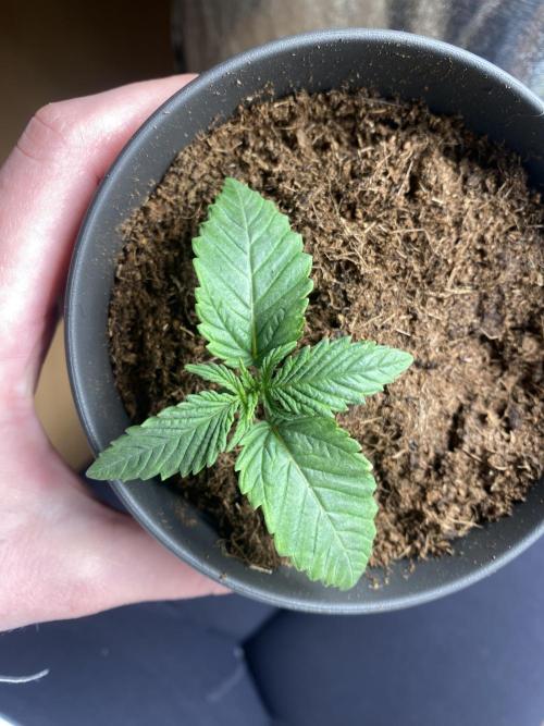 The seed has developed into a small seedling. It’s no longer covered and will now grow under normal conditions in the tent.