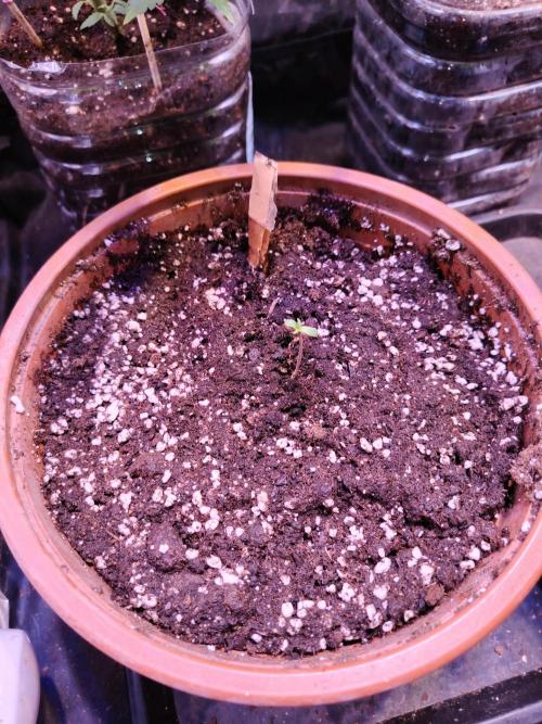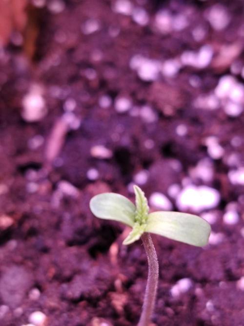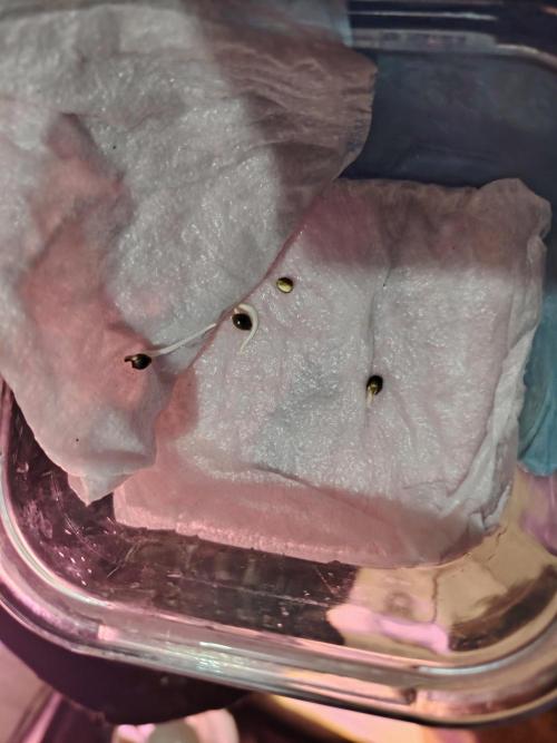 Cato Fueron 4 semillas de las cuales por mi mala manipulación solo 1 vivio y resistio a mis manos toscas, 5 dias germinando al segundo dia desde los primeros 5 se paso a tierra y tras 2 días se ve asi, humedad de 60% y riego con agua embotellada con rociador
