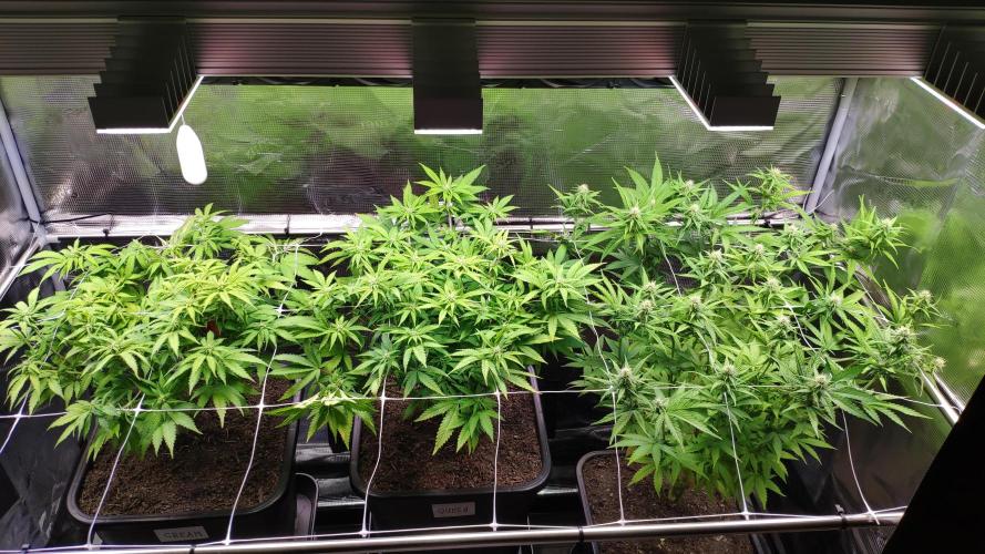 tantrumrage Bud sites are clearly starting to develop now and Kush #1 seems like she's speedrunning flowering. Don't like the SCROG net spacing would prefer smaller squares guess it'll have to go soon.
