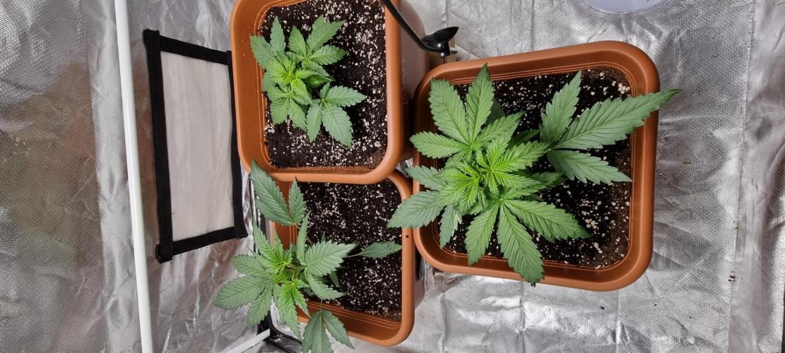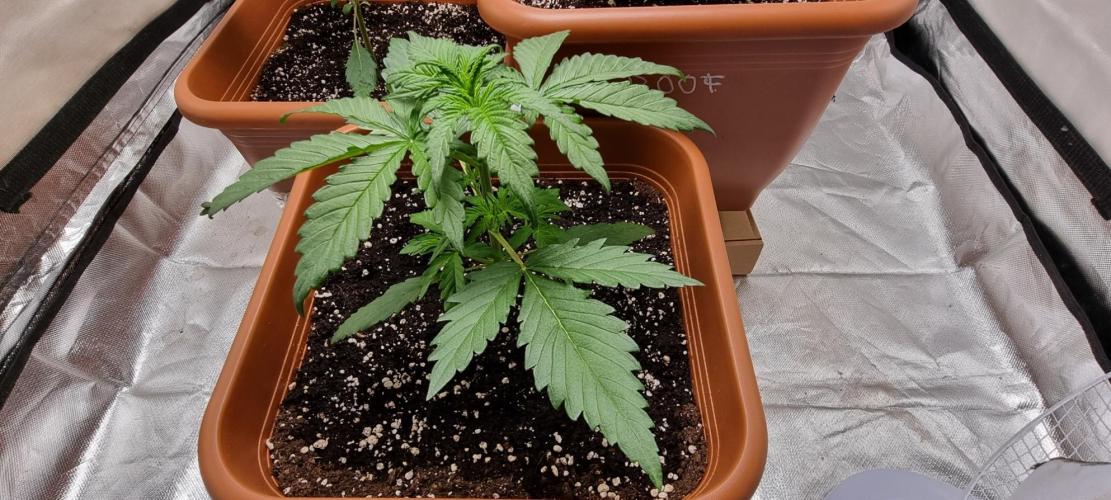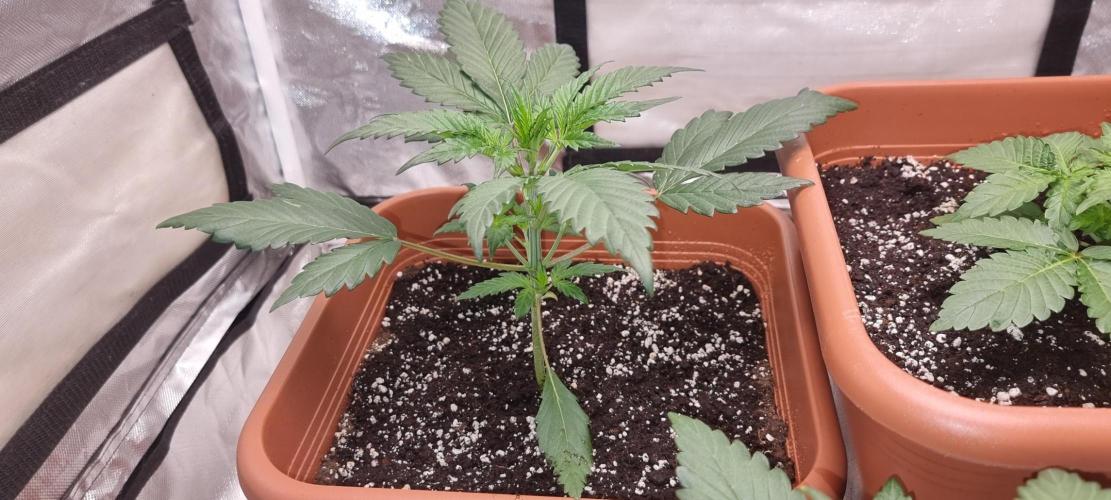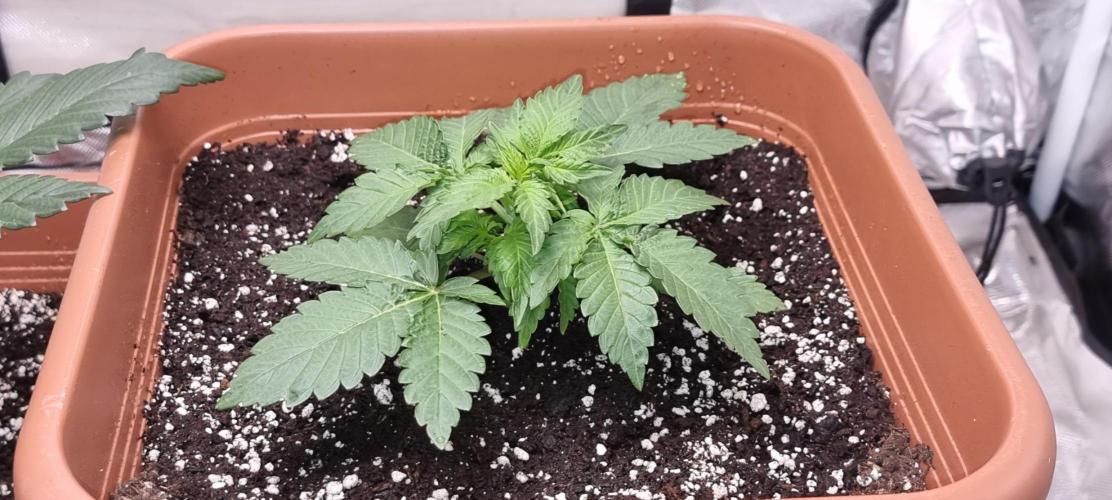 Gorilla Cookies is showing balanced, medium-height growth with nice wide first leaves. Healthy green color and steady development throughout the week.