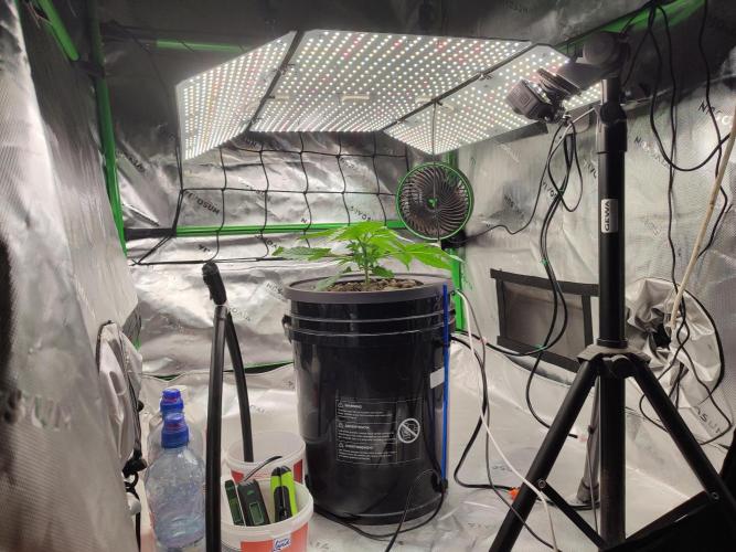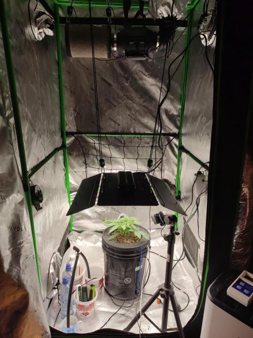 High_And_Hydro Diese Woche gabs eine neue, größere Lampe. Sie hat 400W Gesamtleistung und läuft aktuell auf 20%, also 80W. Die Pflanzenspitze bekommt etwa 450 µmol/s/m², was bei einem Zyklus von 18/6 einen DLI von 29,2 mol/d/m² ergibt.