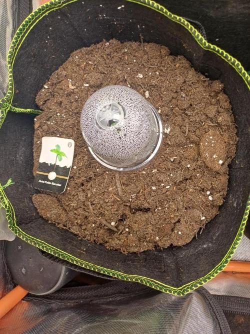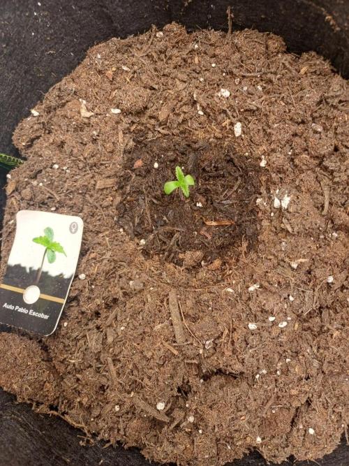 First showing of Pablo since last week. Popped up yesterday and doing well under a dome. Good humidity and temps in tent considering outdoor temps are low and humidity high. No nutes only water from a pipette to soak around seedling and back under the dome for another day or two. Looking forward to seeing Miss Escobar do her thing. Deliberately left room between the substrate and the pot rim so when I remove dome humidity will still be raised a little higher than tent enviroment.
