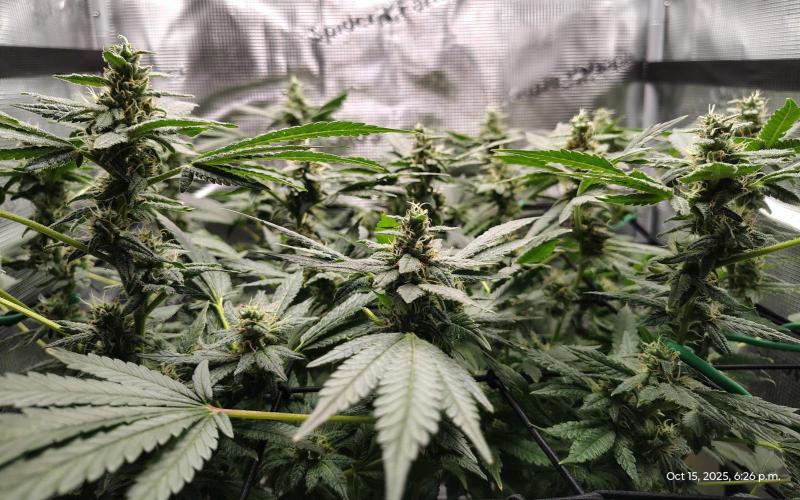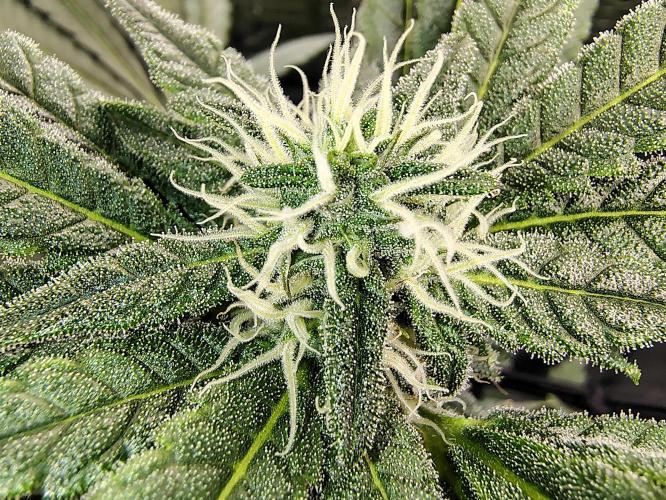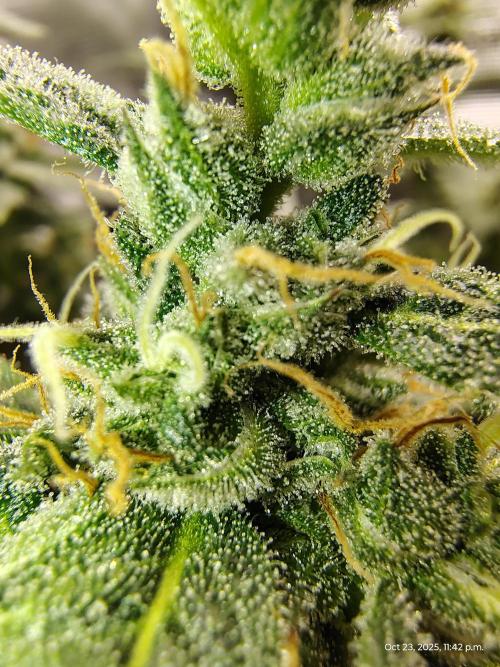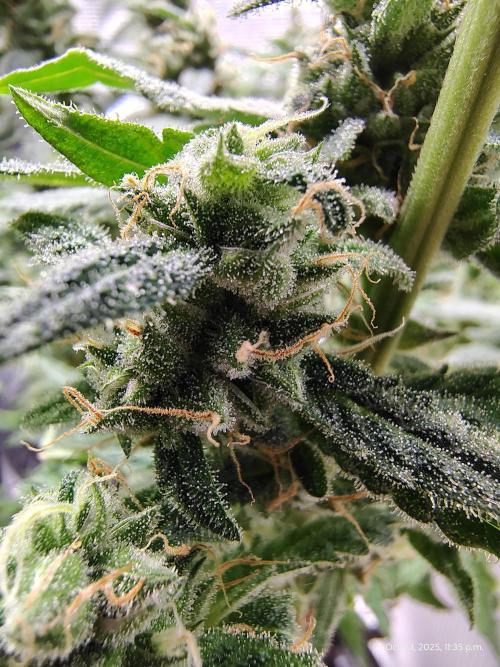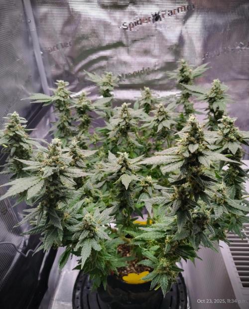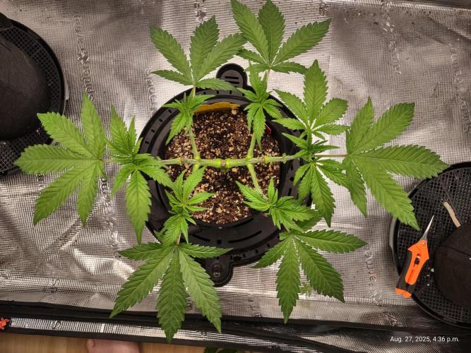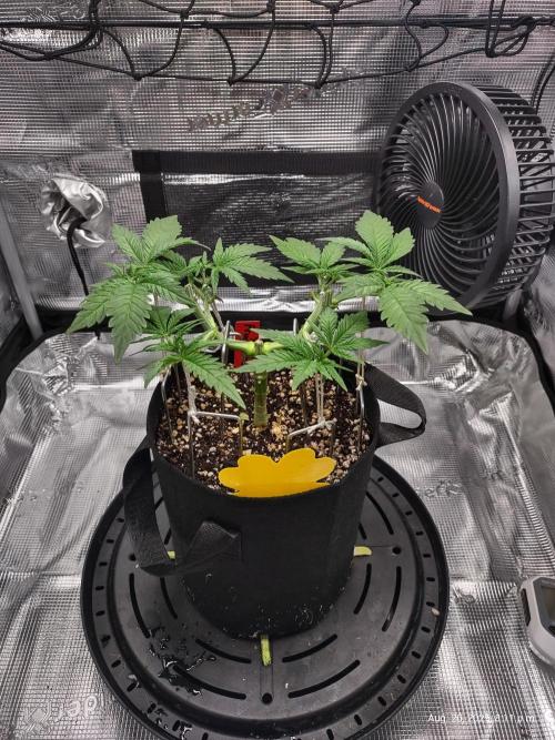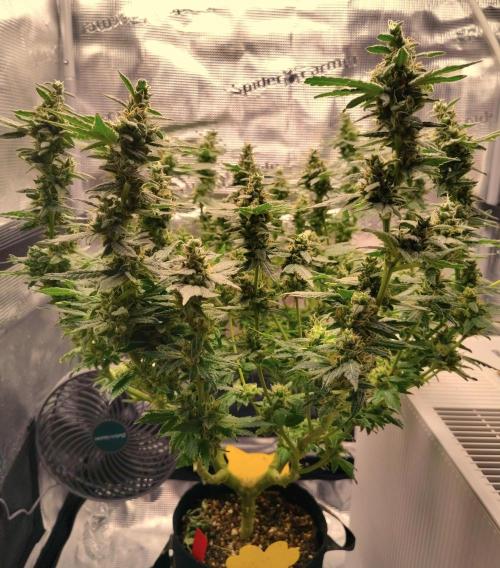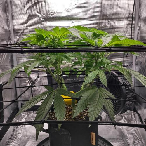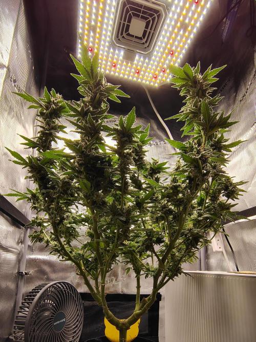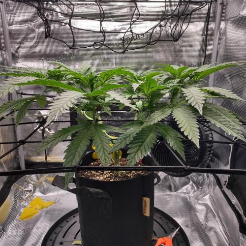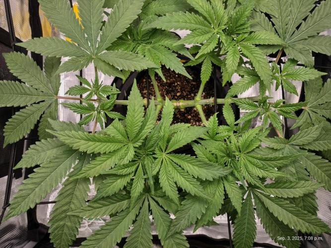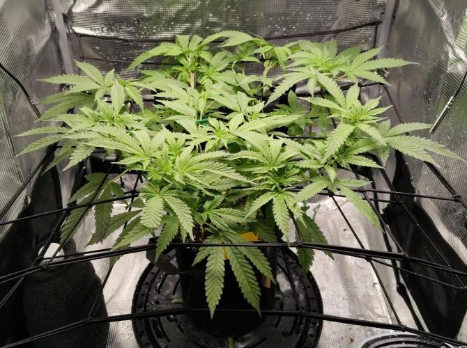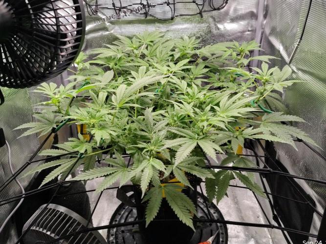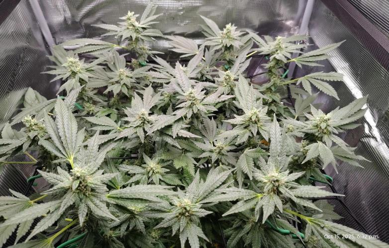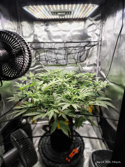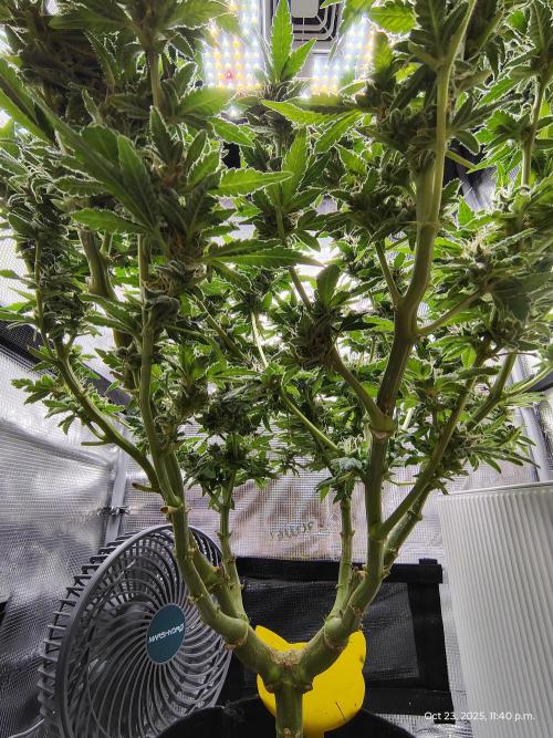 I needed to do some mid-flower defoliation that I should have done a couple weeks ago, and was forced to remove the trellis nets. On the plus side her limbs are stiff and sturdy, and there are definitely seeds developing in some lower sites, and the air flow and light penetration is where it needs to be. I don't anticipate any buds getting too large that they need support. I may move her into the main tent with the other two plants, as its much easier to control the humidity in there, whereas this tent the dehumidifier and exhaust fan (not to mention AC) are all competing and creating a large delta between highs and lows, mostly due to the weather for the past week being raining and really humid.