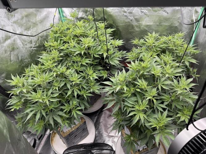 Blacksin01 Mother is in the back right. 4 week veg for all the plants (mother is closer to 8-10 weeks lol). These have all been trimmed and cut back probably 3 times. The growth is rapid. Got a slight tip burn from running the ec to high (1.5). Moved it down to 1.2 and the problem corrected. These are all getting foliar treated with Triacantonal (.01 ppm), Brassinolide (5ppm), and a root drench of Sodium NitroPhenolate-3 (50ppm). I will bump the triacantonal up to 15ppm this week and spray it once a week until week 3 of flower with brassinolide. I treated with the Sodium NitroPhenolate-3 two weeks ago, I’ll treat it again in 1-2 weeks and discontinue after that. My goal is to hit it hard during the stretch and flower set and then let it mature. I’ll only treat with brassinolide after that if I notice any major stress and need to adjust. 9 feeding events. 10s shot at lights up, then 7s shots for the consecutive hours after that. This is all drain to waste. My runoff ec and ph mostly matches input (slight ph up drift). The reservoir is being treated with .5ppm of calcium hypochlorite. Rockwool cubes do have algae growing but they get an occasional mist of hydrogen peroxide and hypoclorous acid.