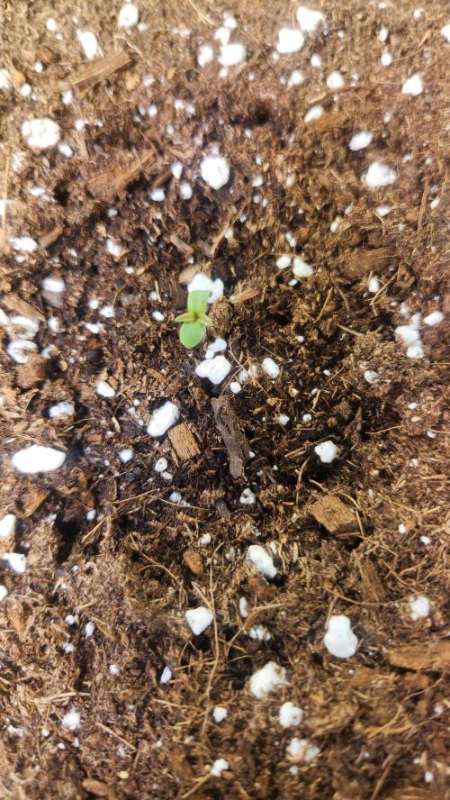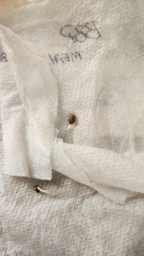 Vicious_Virago They both cracked tap roots after 2 days in a wet paper towel. JH had a longer root and popped from soil first. BBP was fast behind. On 18/6 light cycle. 80° with 70% RH. Light spray of ph'd 5.8 H2O with .5 ml/gl of Cal Mag Puur organic by Cronk nutrients. Will be in 2x2 tent, hand fed, till veg and will move to 4x4 with autopot hookup.