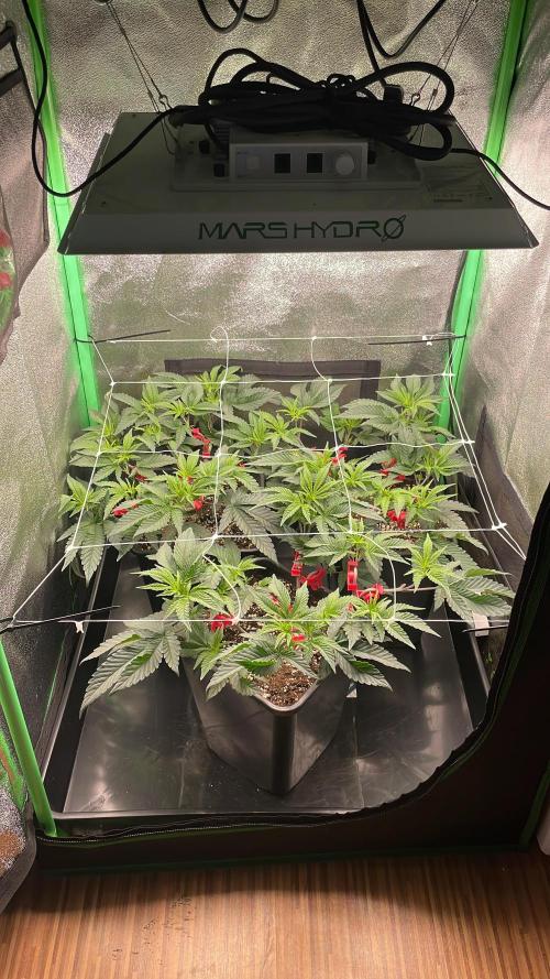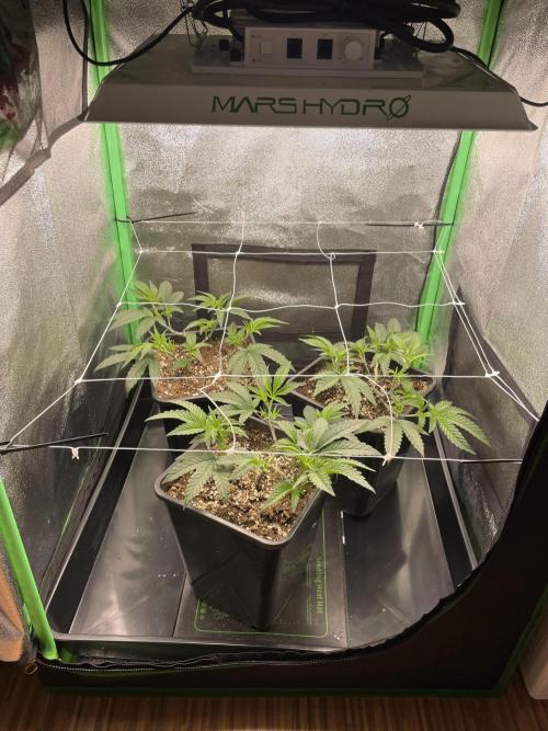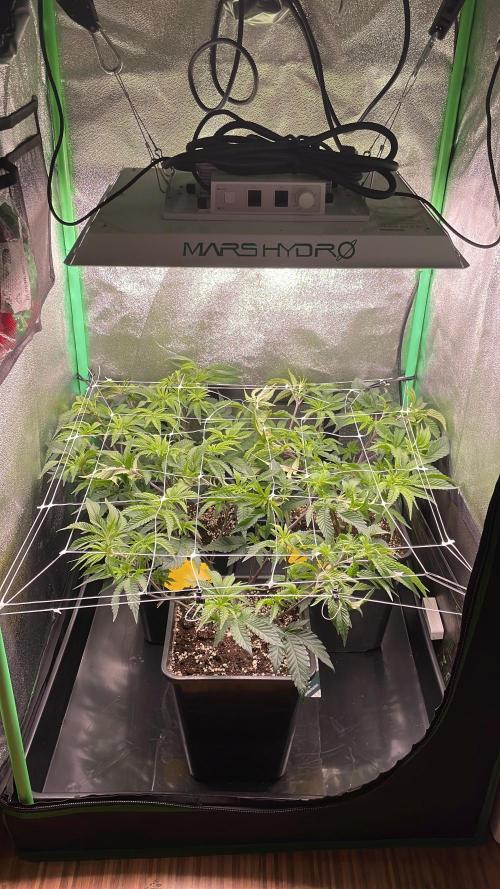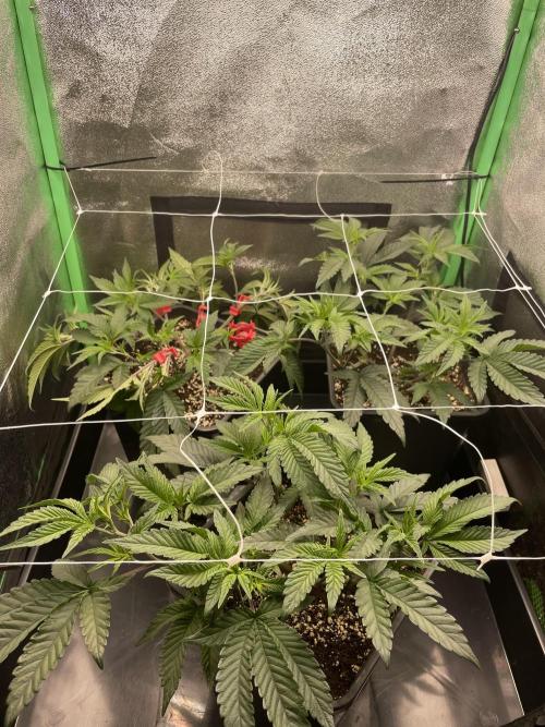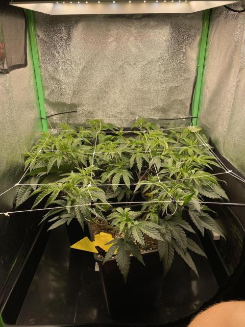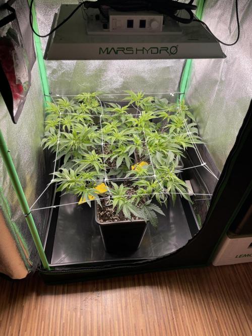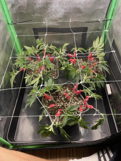 Whodeletti Die Pflanzen hab ich weiter mit LST und Drähten nach unten gebunden um die Pflanzen möglichst breit zu bekommen, bis sie das Netz erreichen.
