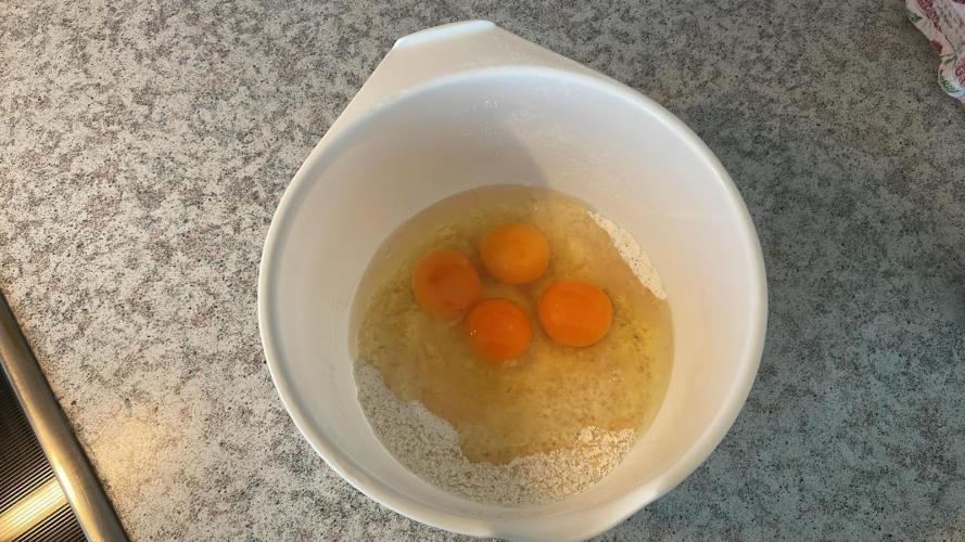 4. Jetzt die restlichen Trockensachen und die Eier mischen in einem seperaten Gefäß.