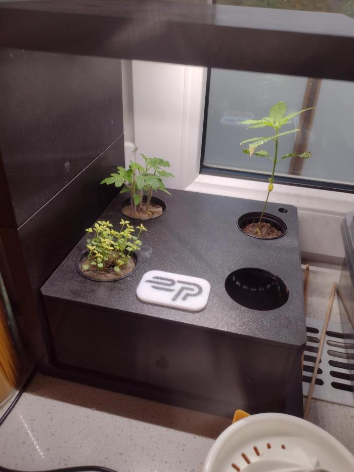 Start of the project. In the small Ekoro indoor farm from Ekoponics we set up a mixed grow: tomatoes, thyme, and experimentally cannabis. Seeds placed into fresh substrate, labeled, and arranged for observation. Baseline light and humidity program activated.