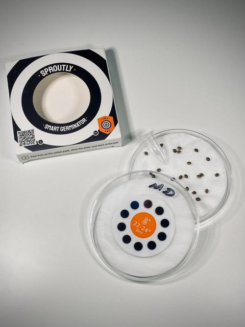 KannaGrowing Germinamos 20 semillas en placa de petri Sproutly by Kannabia siguiendo las instrucciones. 48h después ya tenemos germinadas nuestras semillas, para plantarlas en macetas de 0,75L de sustrato. 5 días después comienzan a salir los cotiledones y primeras hojas reales.