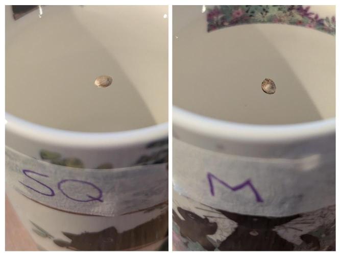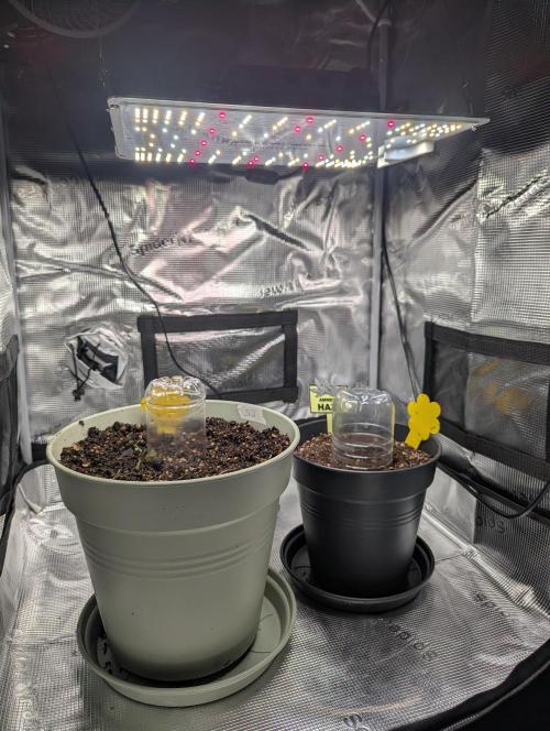 DutchBarnacle 👋Hi there and welcome to this duo diary. Variety is the spice of life, so this diary we'll be growing not one large, but two smaller strains. Our goal is to use the SCroG method to spread out both canopies evenly across the entire area of the tent. Along the way, you'll likely also notice a third, even smaller pot, which is the Amnesia Haze Automatic (S1) from our other, simultaneous diary: https://growdiaries.com/diaries/291478 Strains in this diary: 1 ) Sherbet Queen Auto - Sativa 35% Indica 60% Ruderalis 5% || second time we grow this 2 ) Mimosa Auto - Sativa 65% Indica 30% Ruderalis 5% || very excited! Both plants will live in two plastic 9L pots as an experiment to see how a smaller container size will affect size/yield, as opposed to the fabric 30L bag first grow, and the fabric 19L bag with the Northern Light Automatic of last diary. With all variables being equal except for the strain, we figured it would be less administration to combine the two together. As such, the eventual 'Day 1' will be set to that of the first of these two that properly pops out of her shell. Four hypotheses we test: 1) The Sherbet Queen Automatic will yield less than the last time we grew it. The last grow of the Sherbet Queen Automatic yielded ~48 grams. In that grow, she received LST and full light priority as she was the only plant in the tent. Additionally, the previous Sherbet Queen was grown in a 19L fabric pot. Naturally, we'd expect a lower yield because she's not receiving full light priority and is housed in a 9L pot - in this run. If she does yield more than 50 grams, all the better! 2) It's possible to exceed, or at least match, the yield of the Northern Light Automatic. Combining the Sherbet Queen Automatic, the Mimosa Auto, and the Amnesia Haze (S1) While neither of these two plants are big yielders, they are able to yield at least 50 grams a piece. Hence, we reckon that together they should be able to yield a conservative total of 80grams dry. This would mean a modest yield of 40 grams dry a piece and perhaps some bonus yield of the simultaneous Amnesia Haze (S1) diary. If we manage this, it would open up the future choice between growing a single larger yielder, or multiple simultenous smaller plants - or in other words: allow for more variation of strains! 3) CalMag is not required during transition to flower. At least not in my grow style. Or rather, abstaining from CalMag will not cause issues. CalMag is widely considered a no-brainer. It was used for the first time in the Sherbet Queen Auto diary when she showed signs of a deficiency, but there was no consideration for the cause of that deficiency. In the previous Northern Light Automatic diary, we only added it once during the transition into bloom - and perhaps a second time during bloom. The CalMag of Plagron is in the form of Calcium Nitrate (= N) and thus will add to the Nitrogen levels in the soil. Some sources suggest to abstain from CalMag in the transition to bloom and to only apply it in late bloom or early veg. What we want to find out, is whether our soil mixture has improved enough to abstain from CalMag all together - this hypotheses coincides with number 4. 4) Our Home-made soil mix and nutrient boosters will carry us through the entire grow. Normally, we'd focus on yield of a single plant, justifying the use of mineral based nutrition to 'up' the yield. But since we're growing multiple plants this time in limited space - we reckon it's overkill to also try to pump them up. Moreover: We'll try to keep nutrition organic and circular during this grow. So the soil will have to sustain the plants at least until the transition to bloom, after which we'll most likely brew up a concoction of kitchen waste. ----------------------------------------------------------------------------------------------------------------- Day G0 Both seeds were dropped on top of water in a mug. Day G2 Both shells have popped open and the taproots are peeking out, not far enough to justify planting them already. That, and the heavy rainfall of the past weeks has moistened up the prepared soil - which is stored and revitalized in the garden - to the point that it already has been sitting next to the radiator for two days and is still a bit too moist. Because of that, there's still a bunch of fungus gnats in the soil. Those are expected to dissipate when the soil dries, there's also a few sticky yellow traps. Hence, every day waited to plant the seeds means less fungus gnats in the tent to take care of. Day G3 The simultaneous AH (S1) has been moved to the tent yesterday. Most likely we'll be able to plant these two seeds as well this evening. That evening: Yep, the Sherbet Queen Auto (SQA) was ready to be planted with a taproot of about a full centimeter. The Mimosa Auto (MA) still needs another day or so.
