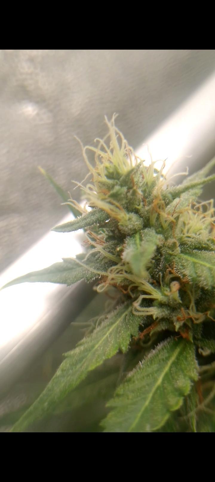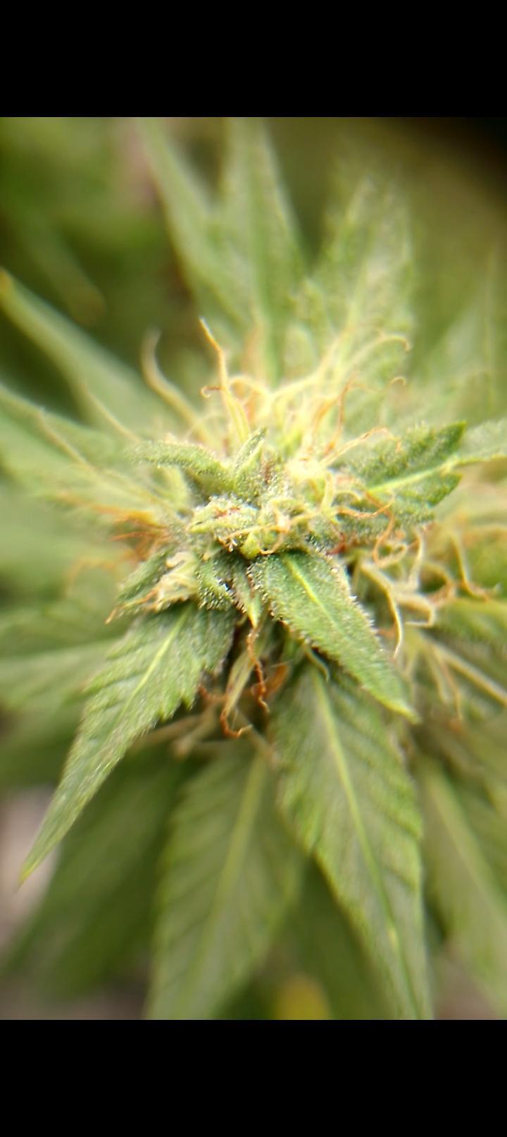 TinyTitania Meine Lady nimmt sehr viel Zeit in Anspruch. Jeden Tag gehe ich dahin und öffne das Zelt um auch dafür zu sorgen, das frische Luft reinkommen kann. Überprüfe, ob sie Wasser braucht, wie die Blätter aussehen und ob ich noch Schädlinge entdecke. Ebenso ob da Bananen herum hängen, die kann ich absolut nicht gebrauchen und machen mir gerade die meiste Angst. Es gibt Tage, da trinkt sie mehr und andere wiederum weniger. Der Stamm ist schon sehr dick geworden, zum Vergleich habe ich eine 1-Cent-Münze drauf gelegt. Nach wie vor keine Zwittereigenschaften. Manche Blätter im unteren bereich sehen ausgetrocknet aus und fallen von alleine ab. Die oberen Blätter sehen unverändert gut aus, die Spitzen sind wie am Anfang nur leicht gelb und scheint gut kontrolliert zu sein. Das erste Mal, dass alles gut zu laufen scheint und nicht wie bei meinen anderen mit Lockouts zu vertrocknen scheint. Die Lampe habe ich noch wenige Zentimeter versucht höher zu hängen, da ich auch Angst habe, dass die obersten Blüten verbrennen. Ich hoffe, dass man die Bilder gut erkennen kann. Auf einigen Buds kann man Terpene erkennen, auf manchen nicht. Ich gehe davon aus, da Titania so lange in der Veggie-Phase war, dass sie nochmal zusätzliche Zeit in der Bloom-Phase braucht. Ich wollte eigentlich einen acht-wochen-plan gestalten, werde es aber um ca zwei Wochen mit dem jetzigen Dünge-chema verlängern und weiter beobachten. Auf einigen Buds sind die Blüten Stempel schon bräunlich und andere wiederum auch noch sehr weiß. Die nächste Woche werde ich noch etwas entlauben und untere kleine Äste abschneiden, damit die nicht zuviel Energie verbrauchen um "repariert" zu werden, die wird weiter oben gebraucht. 💚🤙🏼