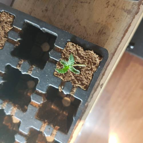 unfortunately she was very slow popping her head up and her first lot of true cannabis leaves are looking a little damaged/mutated like some caterpillars have been eating them.... except theres no caterpillars.