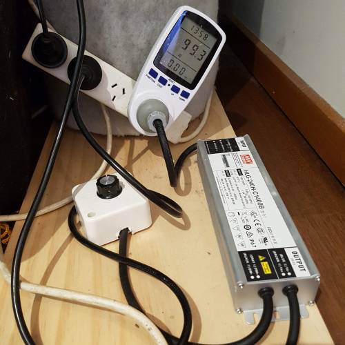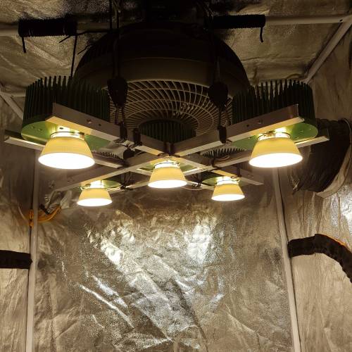 We have them under a single bulb 50W T5 24hrs until theyre rooted, then I'll be moving them into my 800x800x1600cm tent, under my absolutely beautiful DIY LED CLU048 Cob lights! These babies just happened to have lime green anodized heat sinks when they arrived! What a lovely surprise. We assembled the lights together and built the frame from scratch! It was a super satisfying task!!! They even have a sick dimmer (potentiometer) and pump out 250W from the wall.